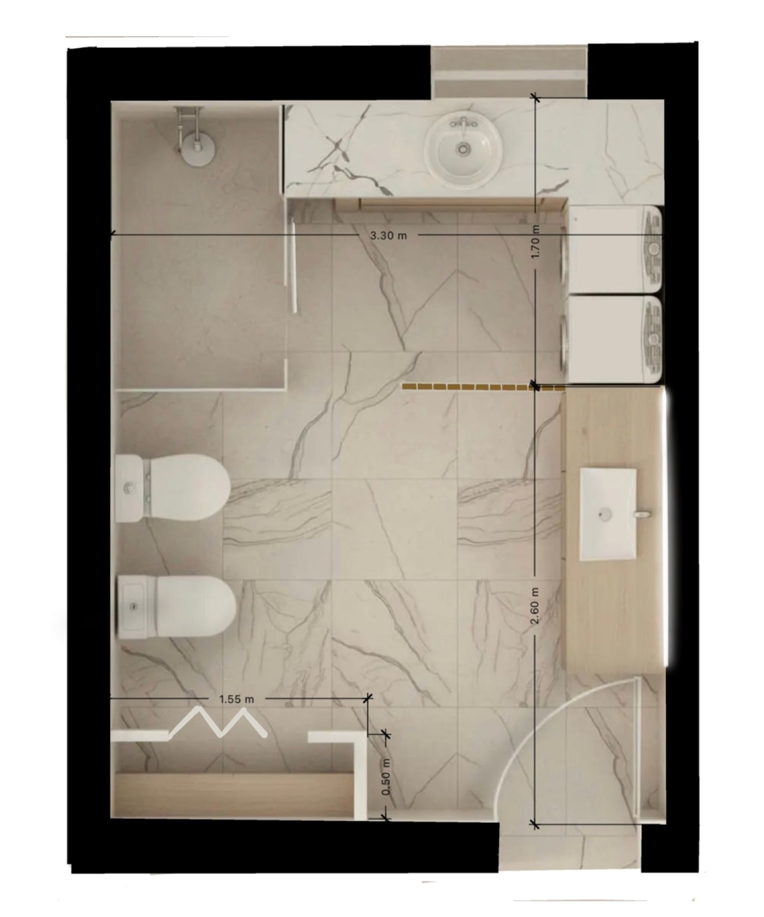 The main bathroom was designed with a clear functional zoning approach: an outer area containing the toilet, washbasin, and a small storage cabinet, and an inner area dedicated to the shower and laundry zone. A decorative partition wall was used to separate the two areas, providing both privacy and aesthetic value.