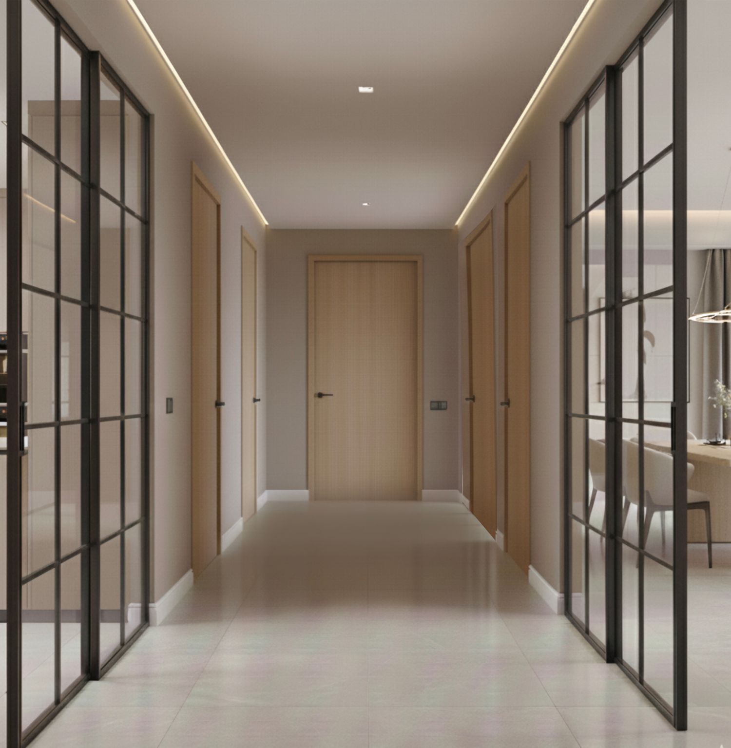 As for the bathrooms, a private en-suite bathroom with a walk-in closet was designed for the master bedroom within the lower-level zone, with consideration given to raising this level to match the rest of the apartment. If this is not feasible, the same design can be implemented by adding two steps at the entrance of the dressing area without affecting the overall functionality.