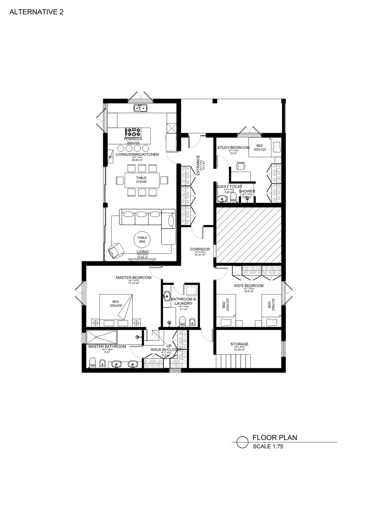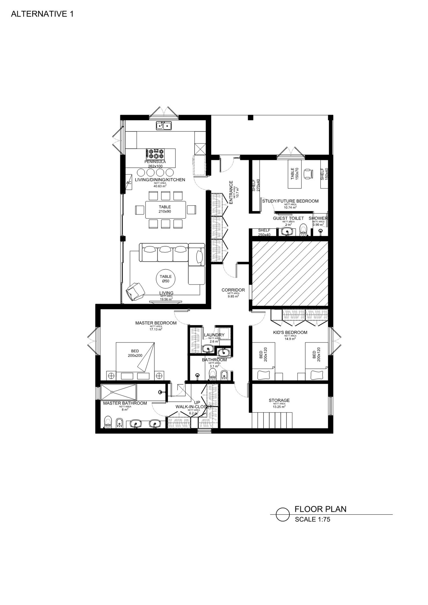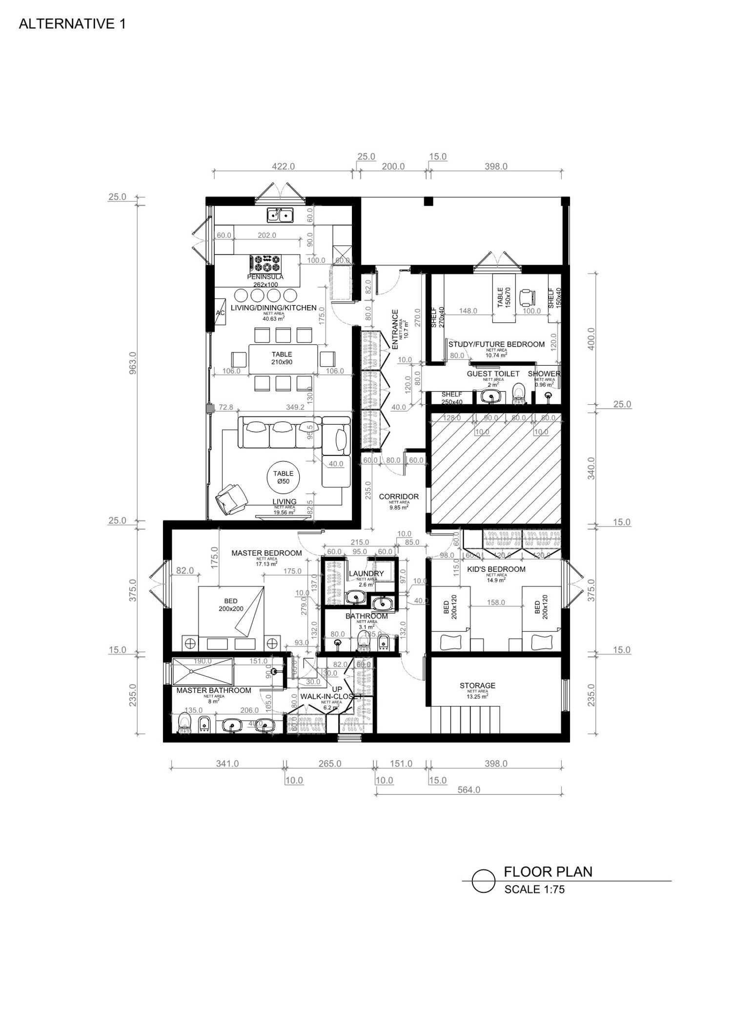 There are 2 alternatives of how to arrage the bathrooms and the former kitchen. I made these options, keeping in mind that you would like to have (or maybe already have) more than 1 child. The former kitchen can be a study/office and future kid's bedroom with it's own access to shower and bathroom. The first alternative proposes a separate laundry room at the cost of smaller bathroom, the second alternative proposes a laundry room that is combined with the bigger bathroom.