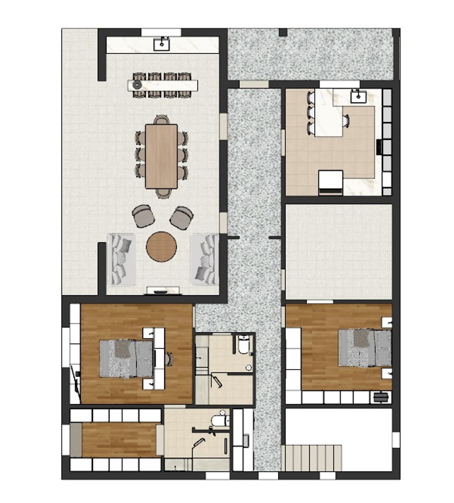 The other important point was to take advantage of the existing bathroom to group the bathroom of the main bedroom, so that it works as a service area that does not interrupt, in this way the sanitary installations would also be grouped together and construction efficiency is generated. Esta propuesta busca ser minuciosa y lo menos invasiva posible para evitar sobre costos y ser lo mas eficiente posible.