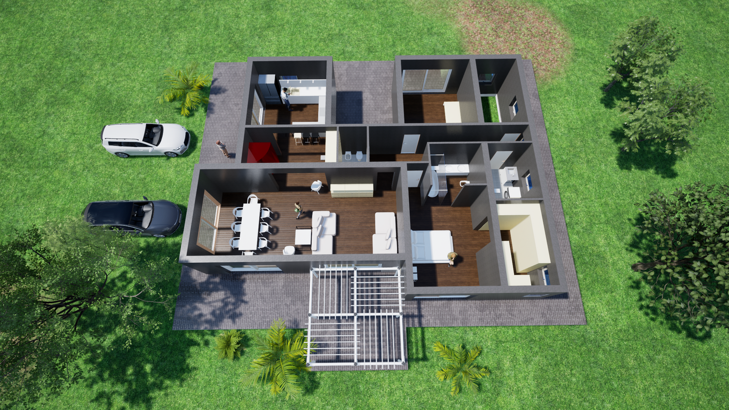 The kitchen, dining room, and living room are fully integrated into a single, continuous space. Ideally, the entrance hall should be relocated to the current semi-covered outdoor area in order to avoid accessing the house directly through the circulation between the kitchen and dining room. However, this would constitute a more extensive renovation, as it would also require the construction of a new semi-covered entrance area.