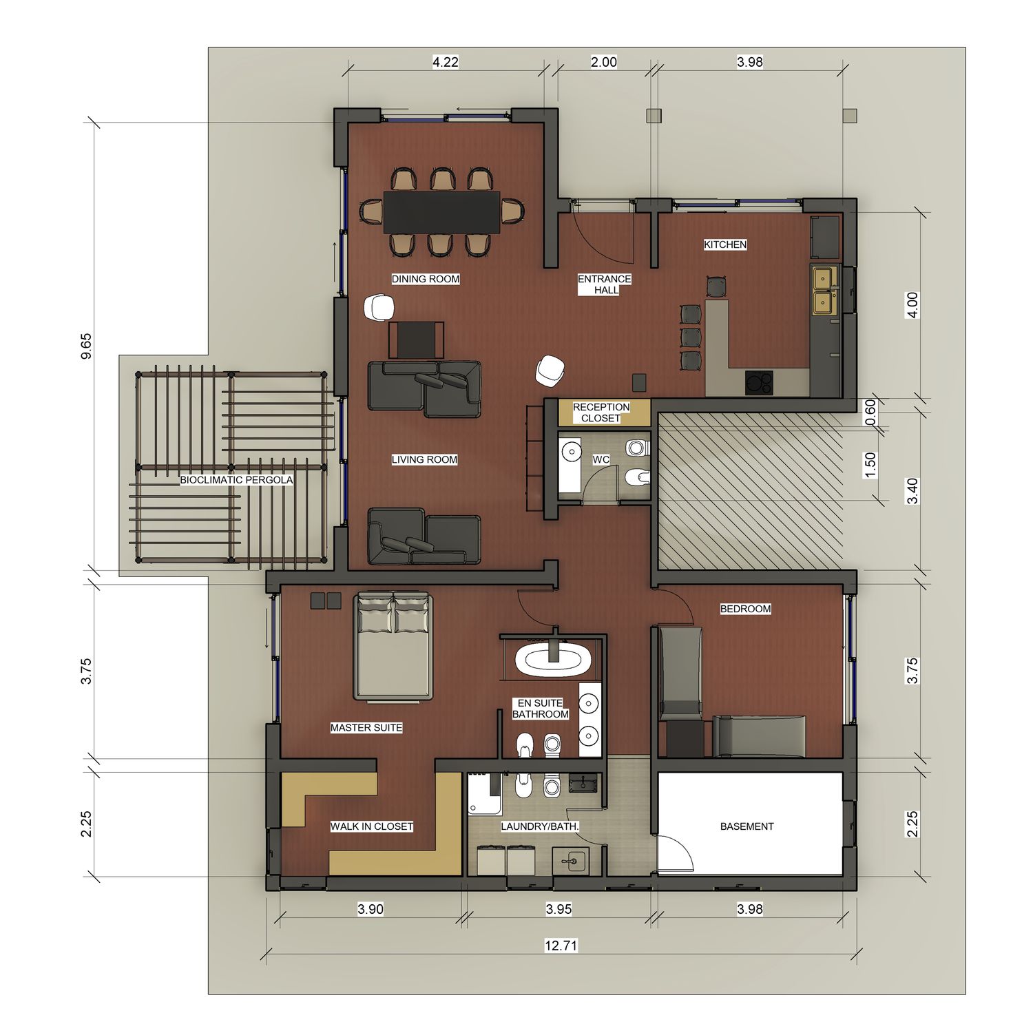 In the living room, we propose an expansion toward the garden through the incorporation of a bioclimatic pergola, strengthening the indoor–outdoor relationship.