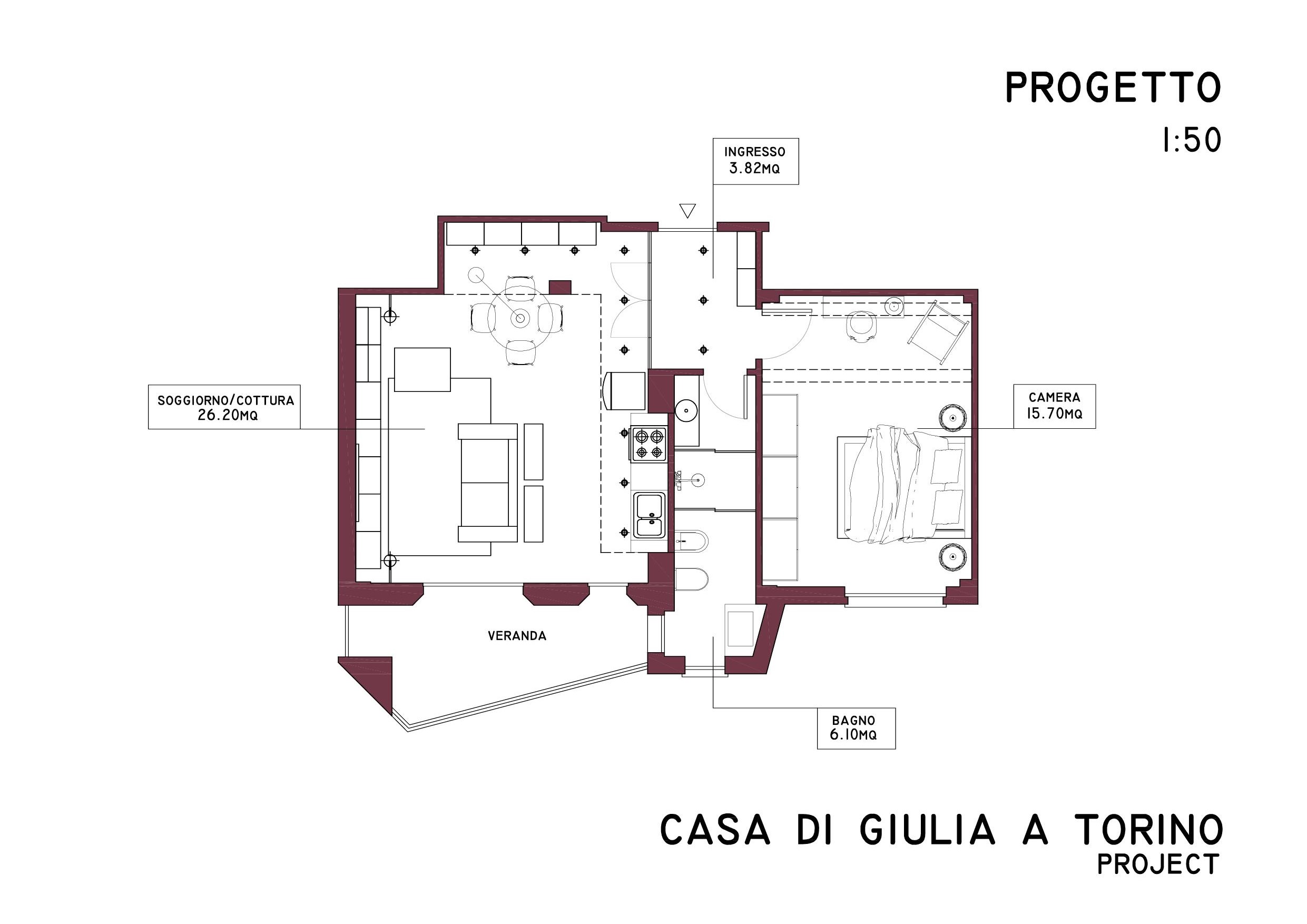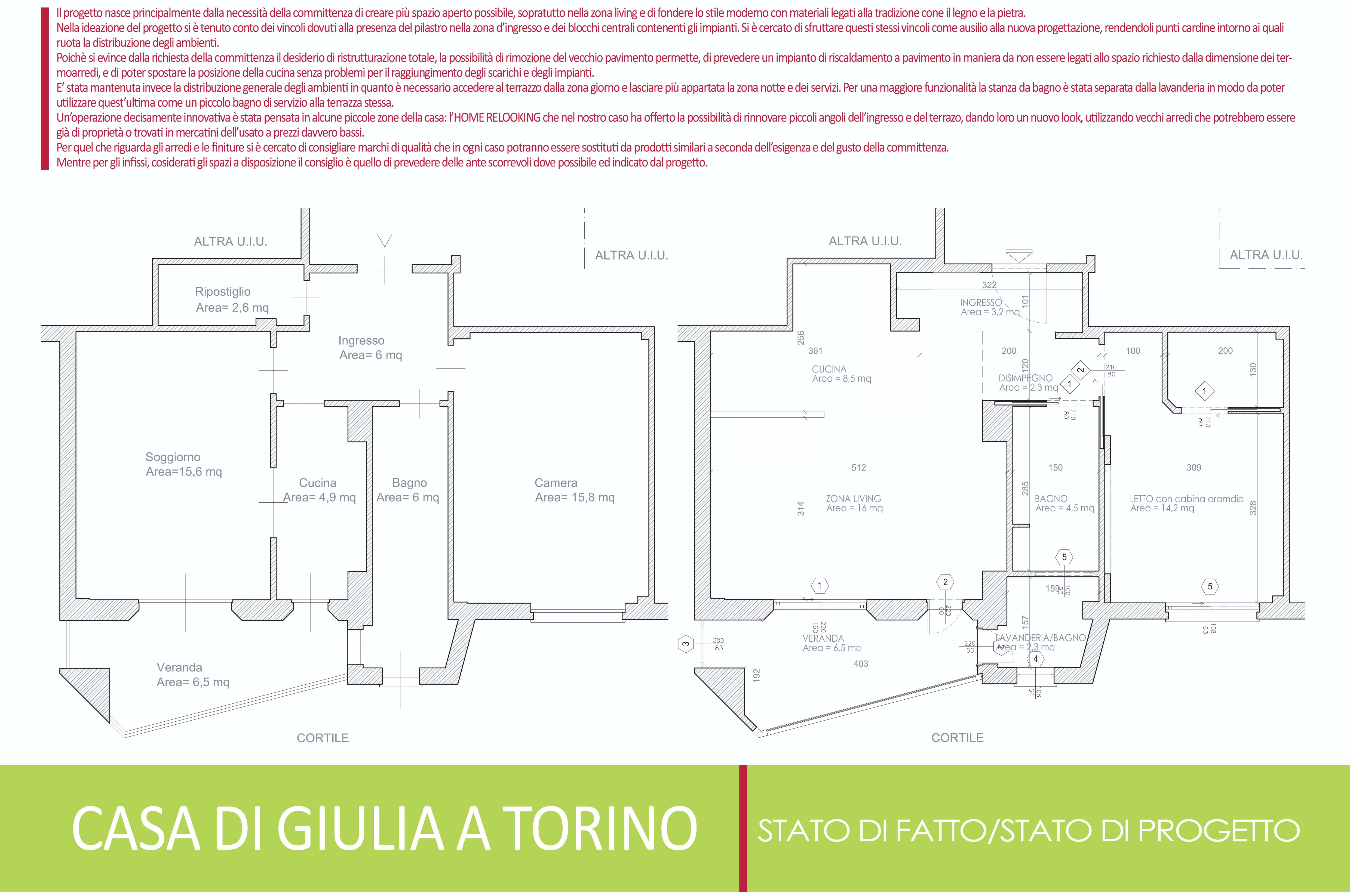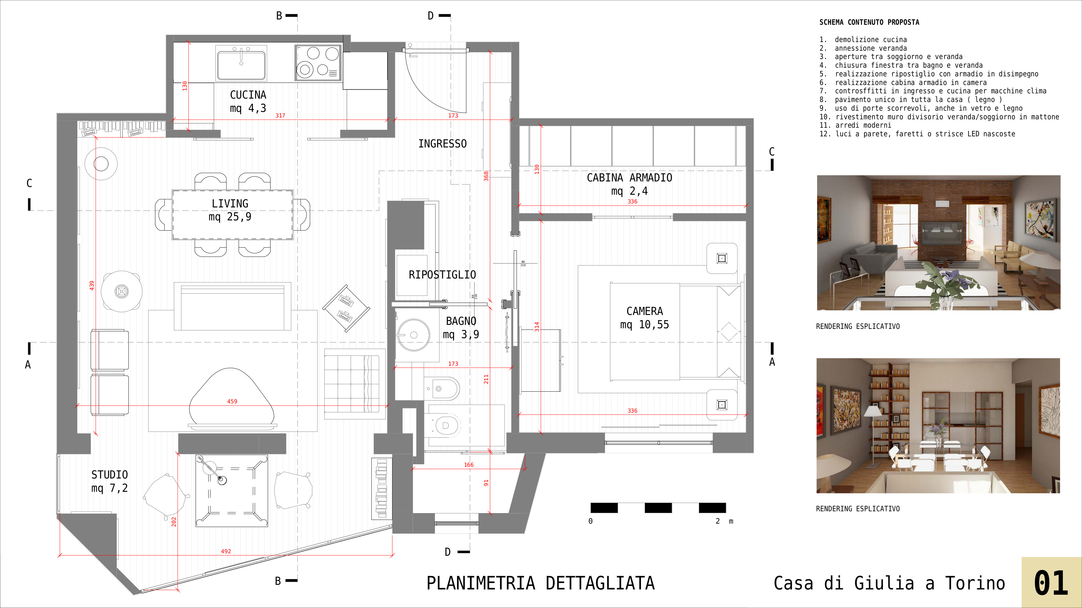Una razionalizzazione degli spazi; creazione spazi aperti; contrasti tra moderno e utilizzo del legno. In un futuro prossimo la casa diventerà residenza di una giovane ragazza ma al momento sarà destinata a reddito. Per una coppia giovane. Sono gradite le superfici vetrate e le luci perimetrali nelle stanze nascoste dal cartongesso. No a lampadari e plafoniere. Sì, nel possibile, a porte scorrevoli.