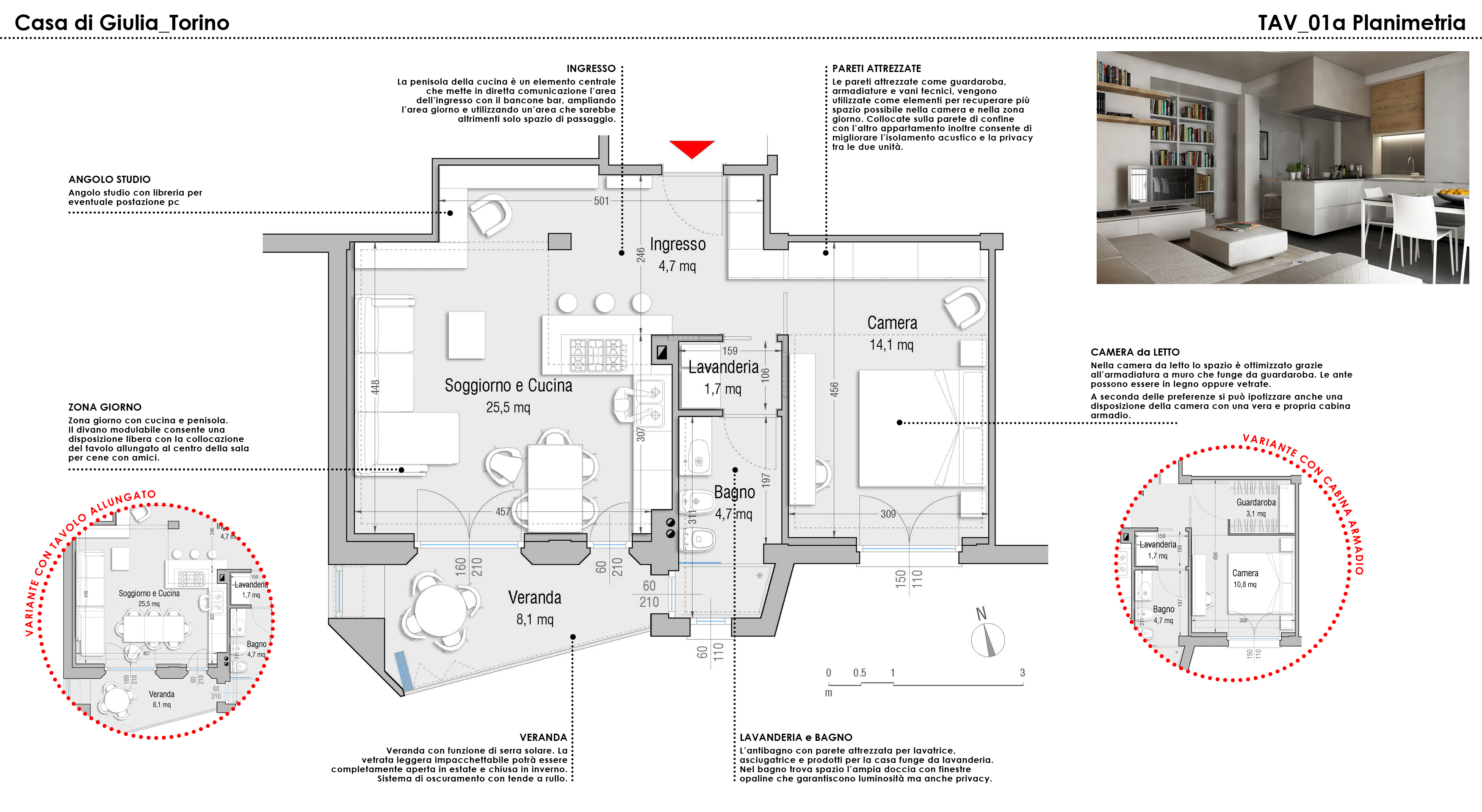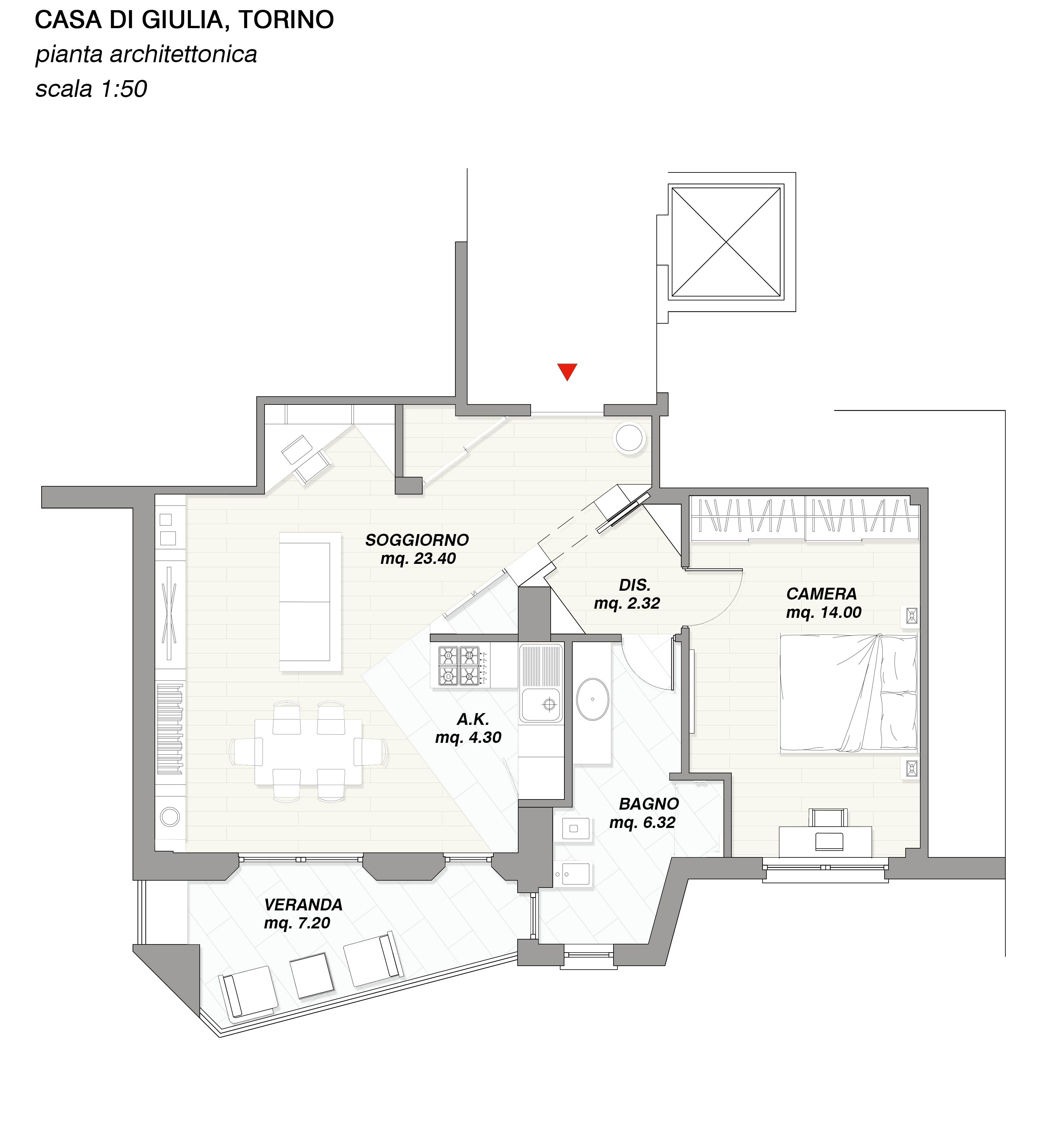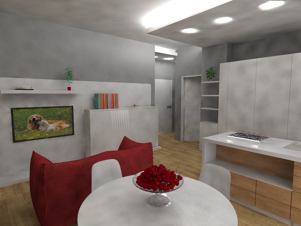 Una razionalizzazione degli spazi; creazione spazi aperti; contrasti tra moderno e utilizzo del legno. In un futuro prossimo la casa diventerà residenza di una giovane ragazza ma al momento sarà destinata a reddito. Per una coppia giovane. Sono gradite le superfici vetrate e le luci perimetrali nelle stanze nascoste dal cartongesso. No a lampadari e plafoniere. Sì, nel possibile, a porte scorrevoli.