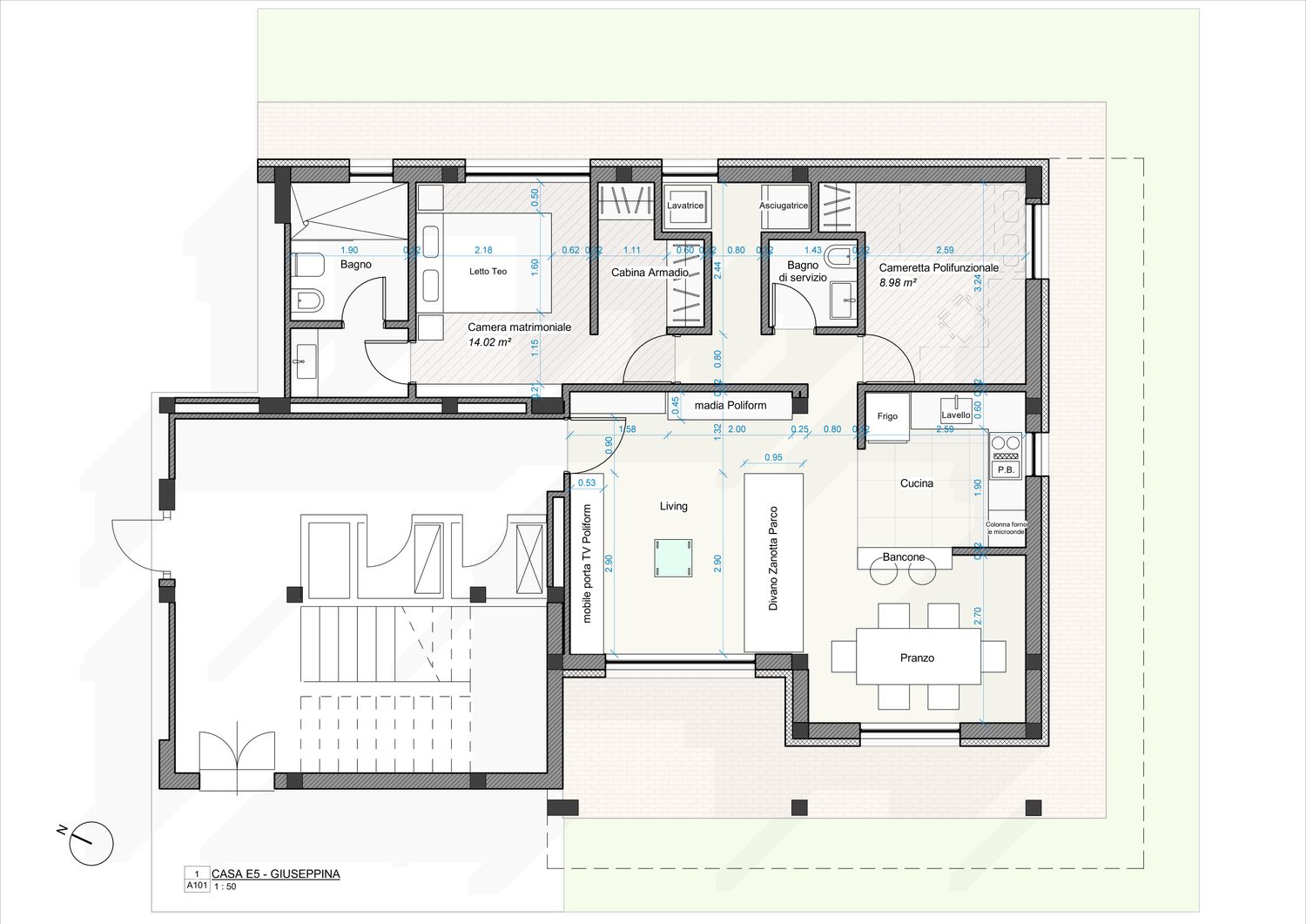 Proseguendo verso la camera padronale di 14 mq, si accede a una cabina armadio composta da due armadi. Lo spazio destinato al letto Teo presenta dimensioni adeguate a garantirne il corretto inserimento; è inoltre prevista una piccola nicchia, in asse con la parete, destinata ad accogliere un elemento decorativo. Il bagno esistente viene mantenuto come bagno padronale, con l’unica modifica relativa alla doccia, riprogettata a tutta larghezza.