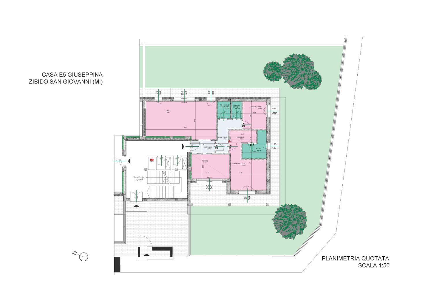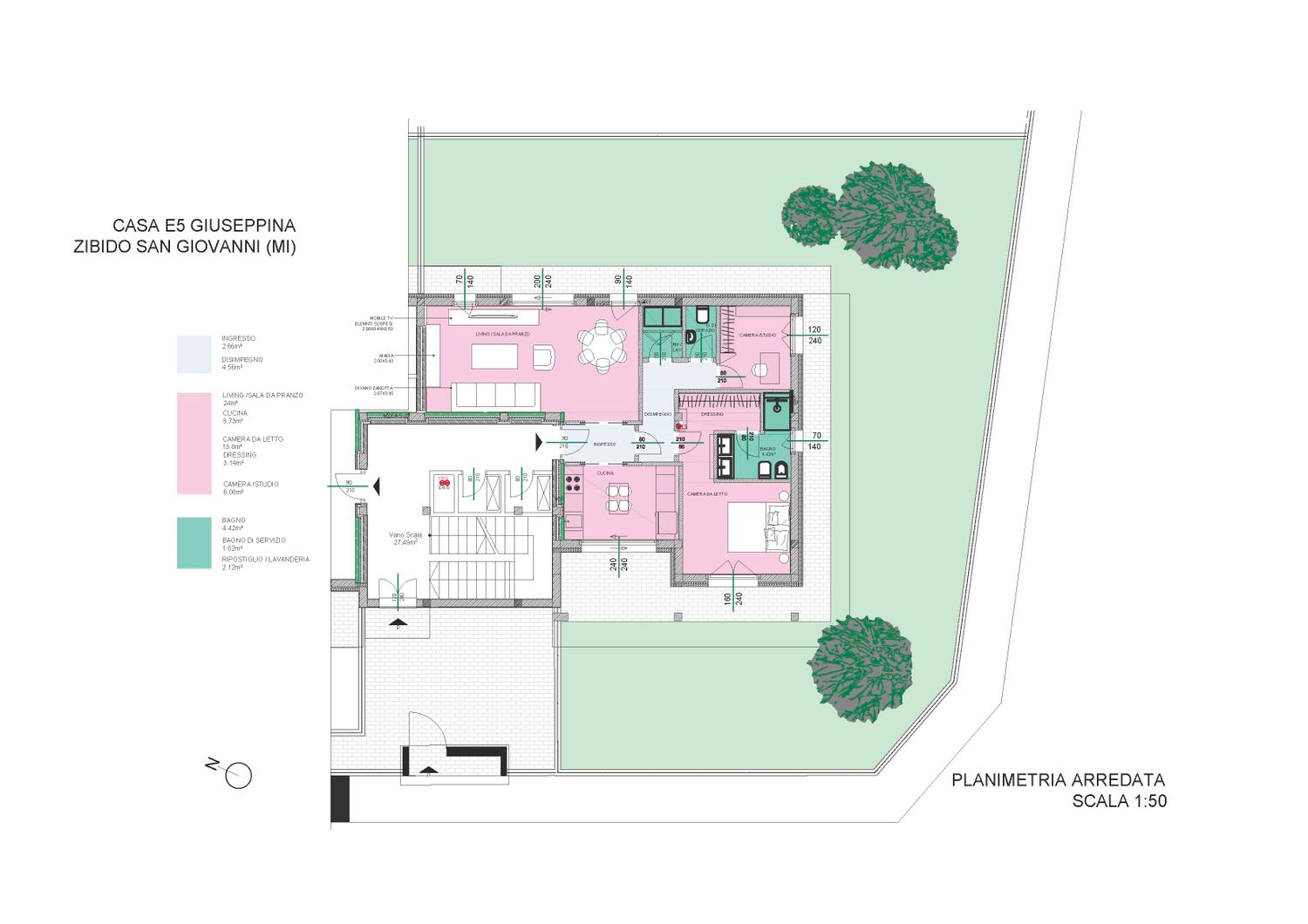 Alcuni vincoli, come le dimensioni di arredi che il cliente vorrebbe conservare (divano, madia e mobile TV) e come la necesiità di avere una grande camera da letto con dressing mi hanno condotto a sacrificare l’idea iniziale di fare un living con una doppia esposizione. Le dimensioni imponenti del divano richiedono un living spazioso e una cucina separata.