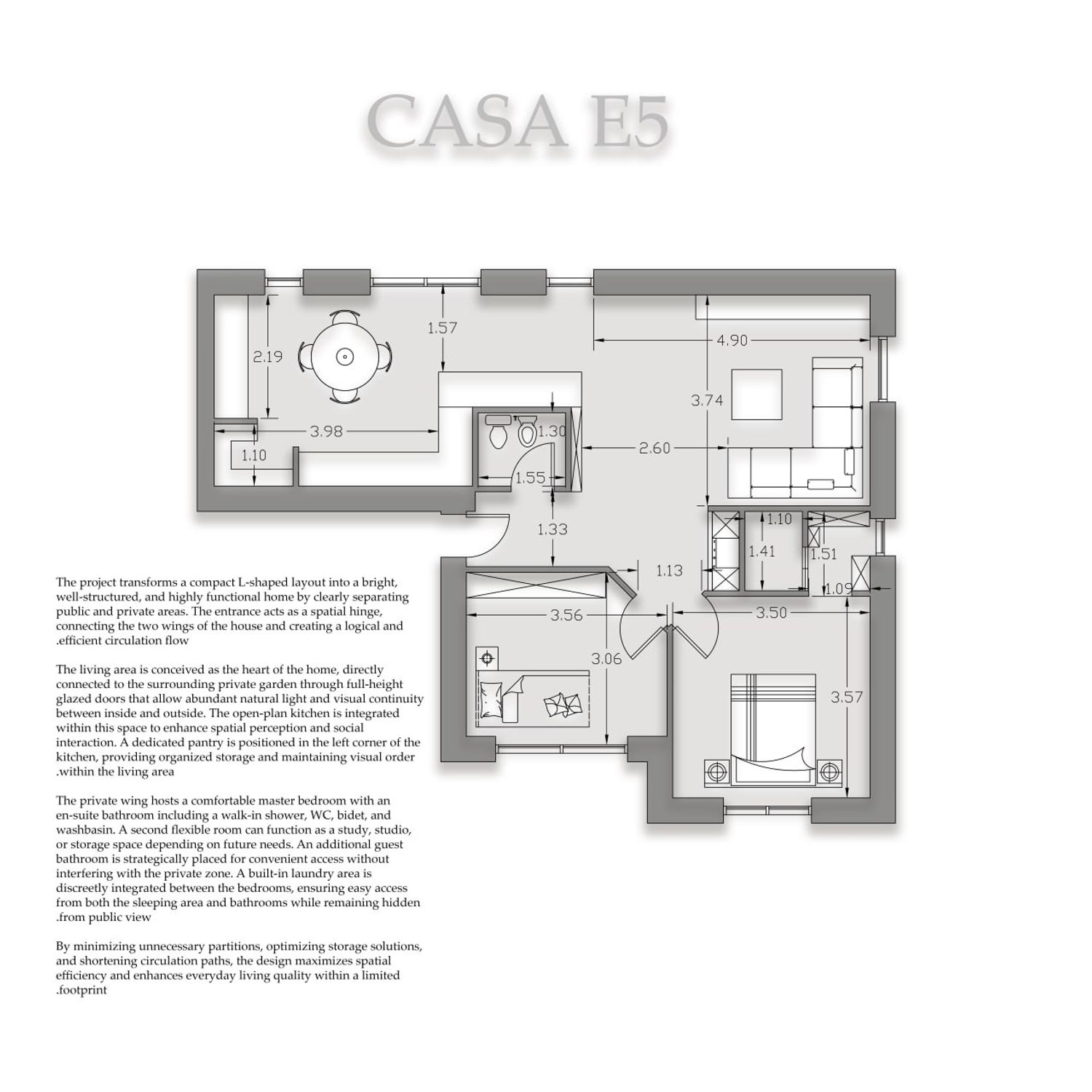 CASA E5 is an exploration of how a compact footprint can be transformed into an intelligent, light-filled, and highly livable home—one where spatial quality is perceived as greater than its actual dimensions. The L-shaped layout is embraced as a design opportunity rather than a constraint, allowing the clear and natural separation of public and private zones without generating wasted corridors or residual spaces. The entrance is positioned at a pivotal central point, functioning as a spatial hinge that connects the two main realms of the house while establishing a logical, fluid circulation flow.