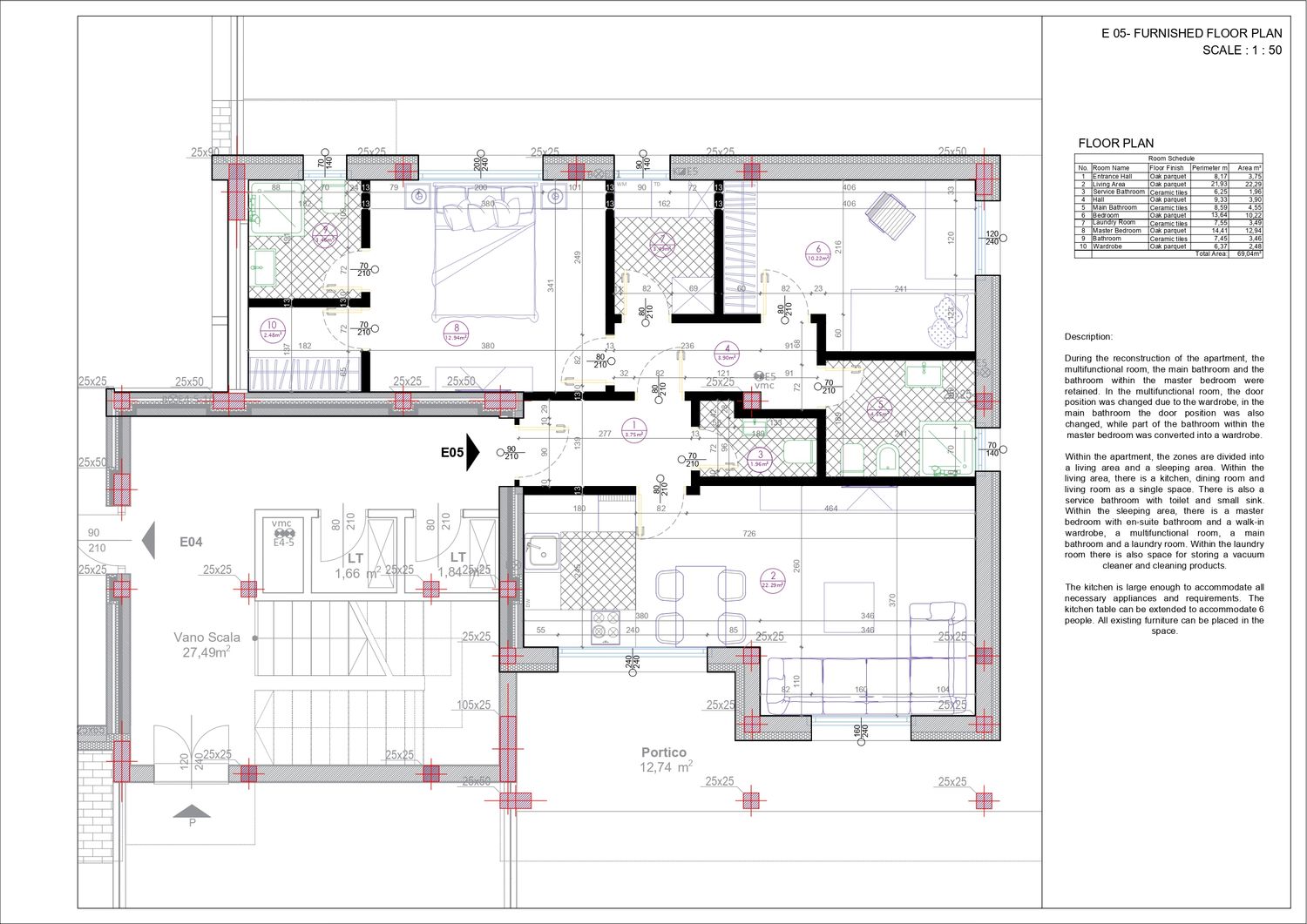 During the reconstruction of the apartment, the multifunctional room, the main bathroom and the bathroom within the master bedroom were retained. In the multifunctional room, the door position was changed due to the wardrobe, in the main bathroom the door position was also changed, while part of the bathroom within the master bedroom was converted into a wardrobe.