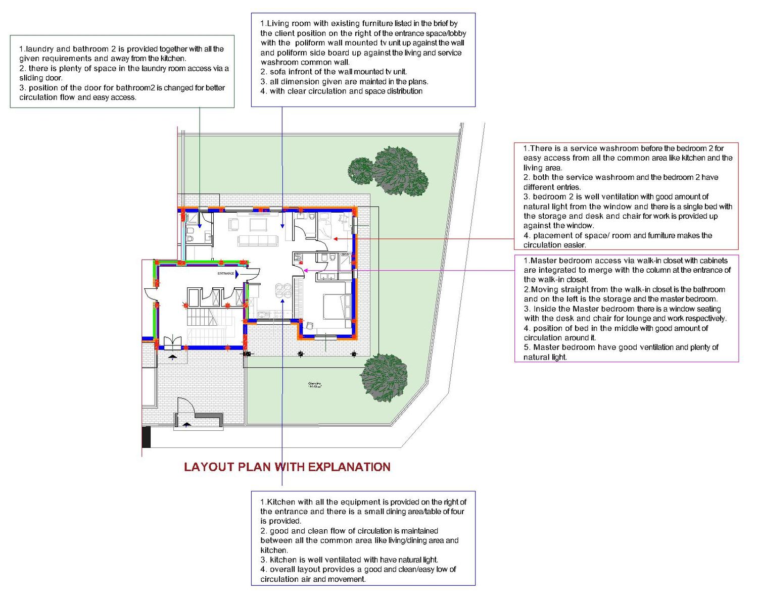 Layout is design to maintain a clear and easy flow of movement. Keep the furniture minimal but maintained the exiting furniture with the exact dimensions in the plans.