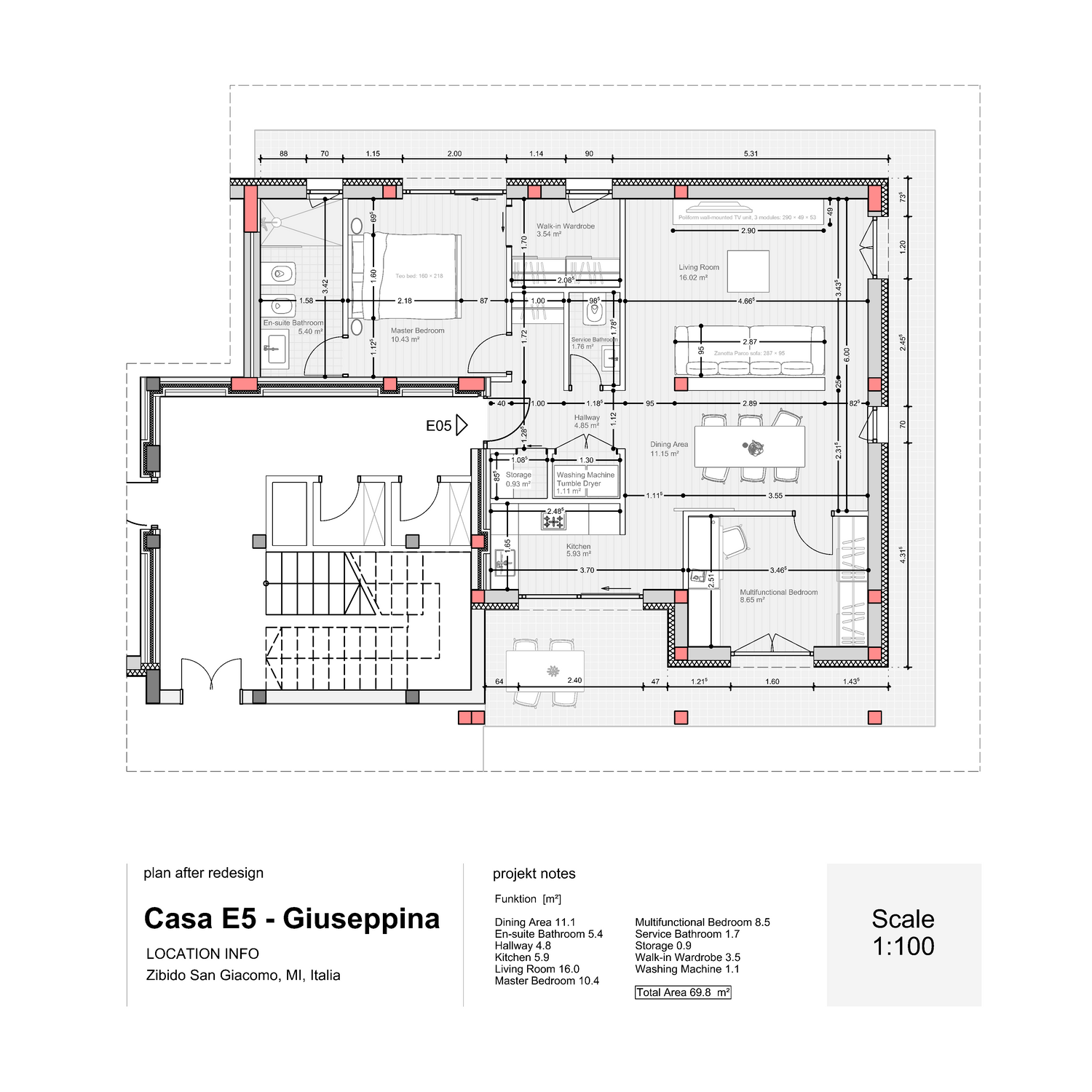 In the entrance area, two small and discreet rooms were created: one functioning as a storage space with semi-open shelving, and the other dedicated to the washing machine and tumble dryer. From the entrance hall, there is also direct access to the guest/service bathroom, ensuring practicality and ease of everyday use.