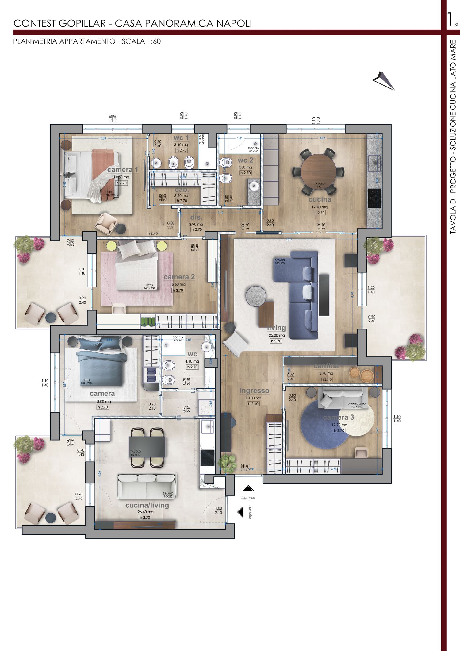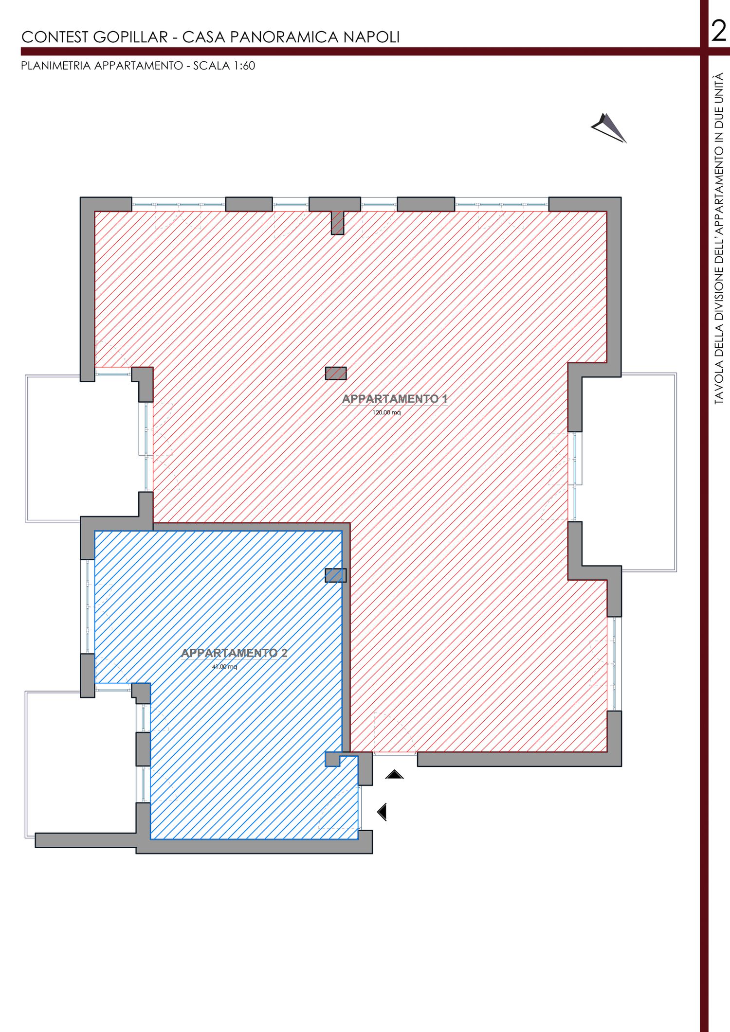 per il progetto della suddivisione del Suo appartamento in due unità, ho pensato di dedicare, sfruttando i due ingressi esistenti, la parte panoramica per Lei e la Sua famiglia, mentre la restante, con metratura ridotta, all'appartamento che sarà fittato.