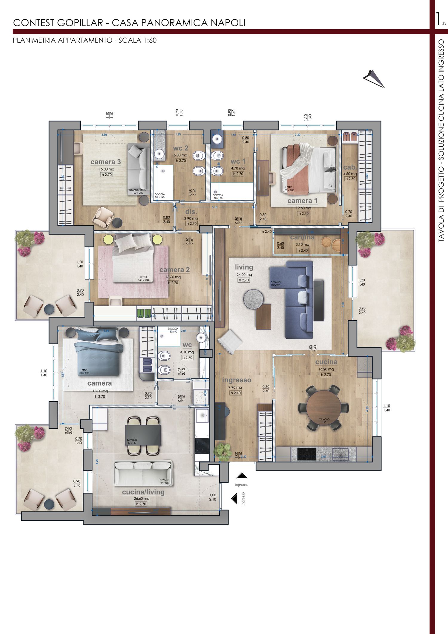 Per la Sua dimora, quindi, ho immaginato due soluzioni: la prima vede un ampio ingresso con soffitto ribassato, che porta al living, quest'ultimo dotato di accesso al terrazzo. Qui si affacciano sia la cucina tramite vetrate scorrevoli, sia la cantina walk in, il cui accesso però è posto all'ingresso dell'appartamento, dal quale in oltre è possibile entrare anche nella stanza-studio arredata con divano letto, armadio e scrittoio.