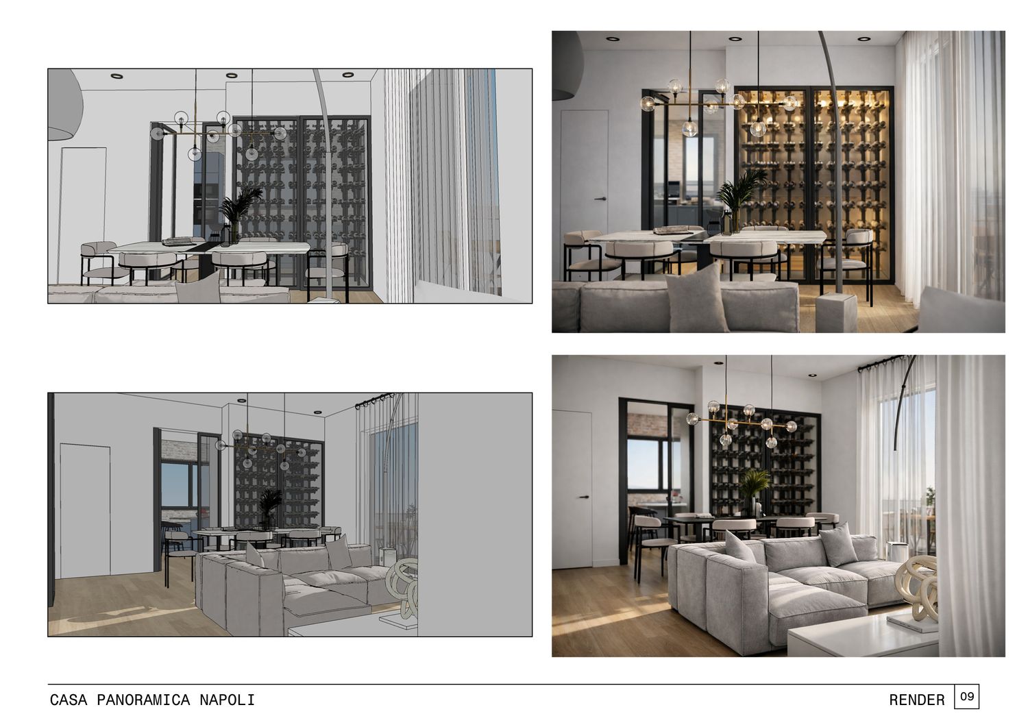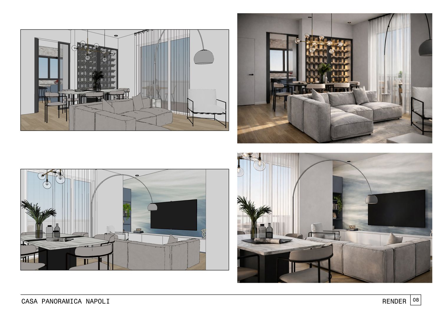 Nella prima parte si incontra il soggiorno, con il divano angolare e la televisione da 65”, richiesti dalla committenza.