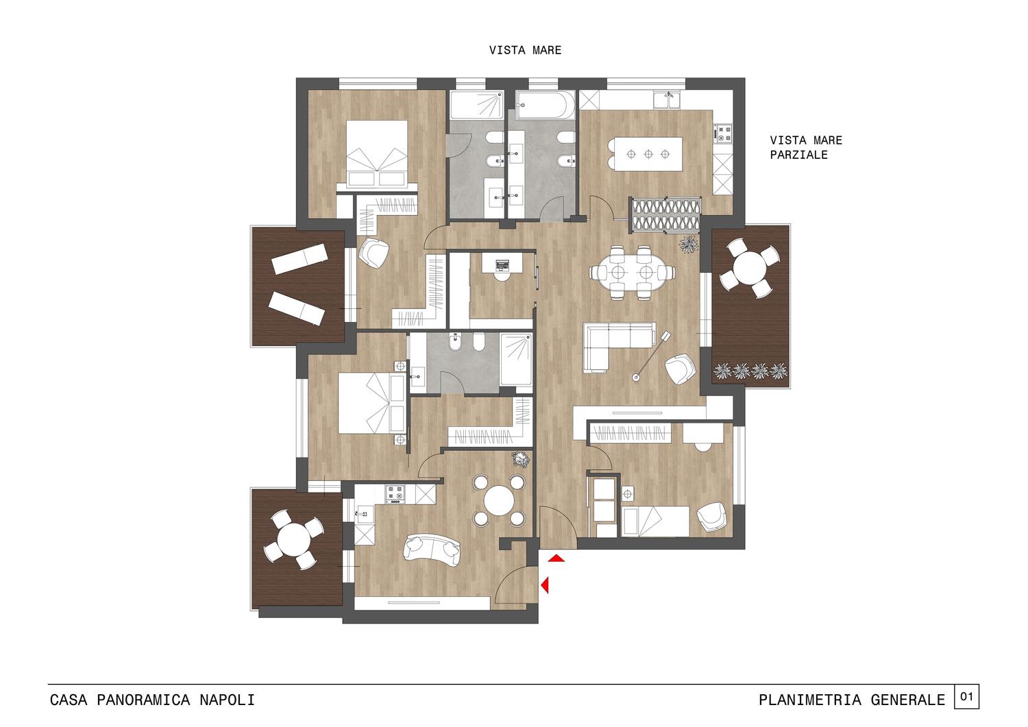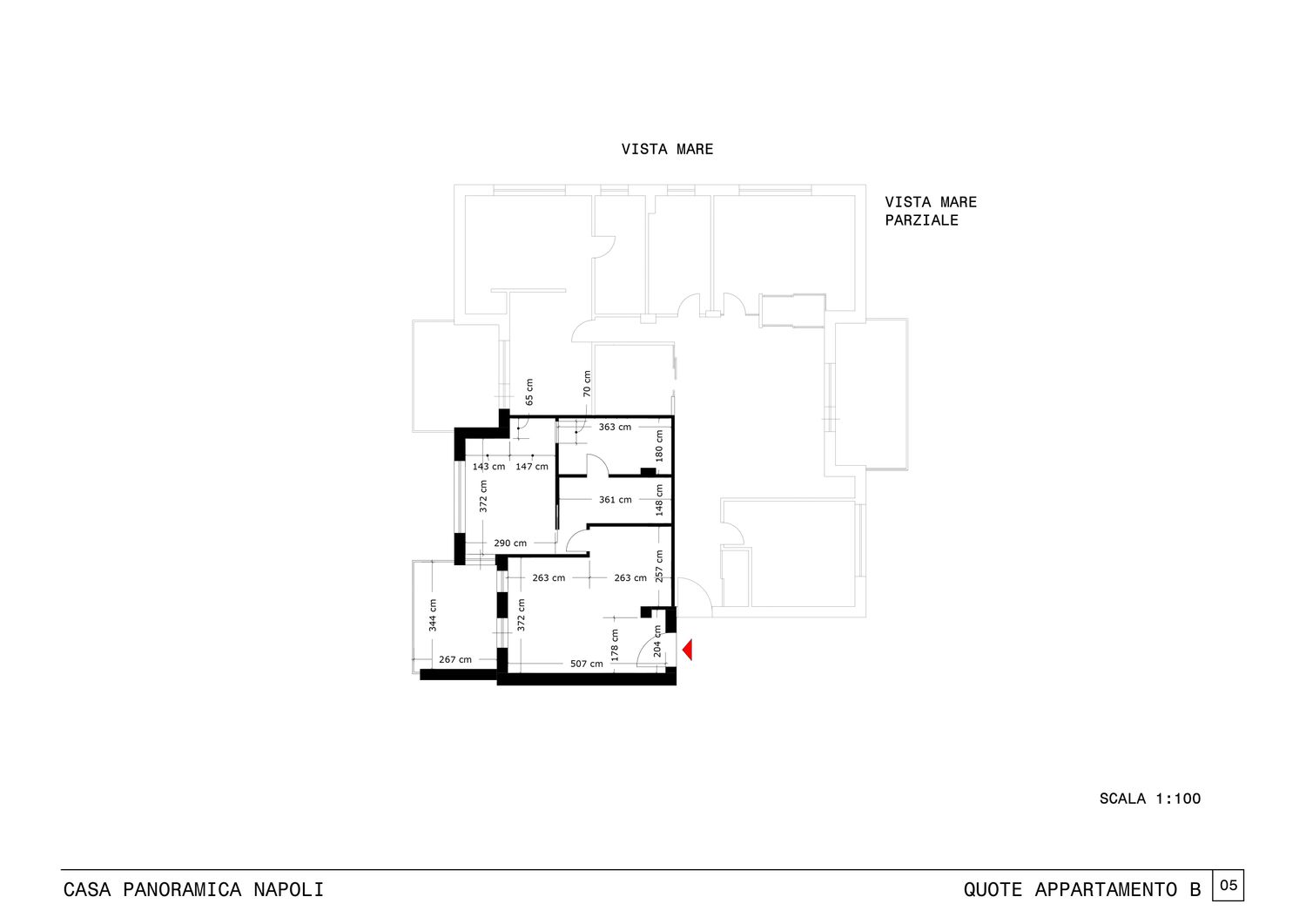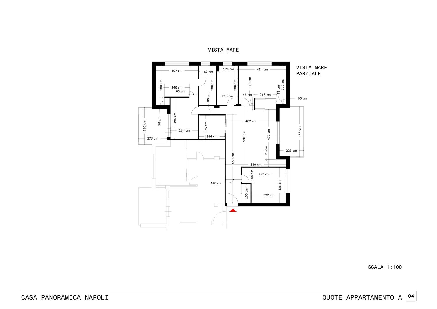 Il progetto “Casa panoramica Napoli” prevede la suddivisione di un appartamento esistente di 188 mq con vista mare, situato al 4° e ultimo piano dell’edificio, in due unità indipendenti.