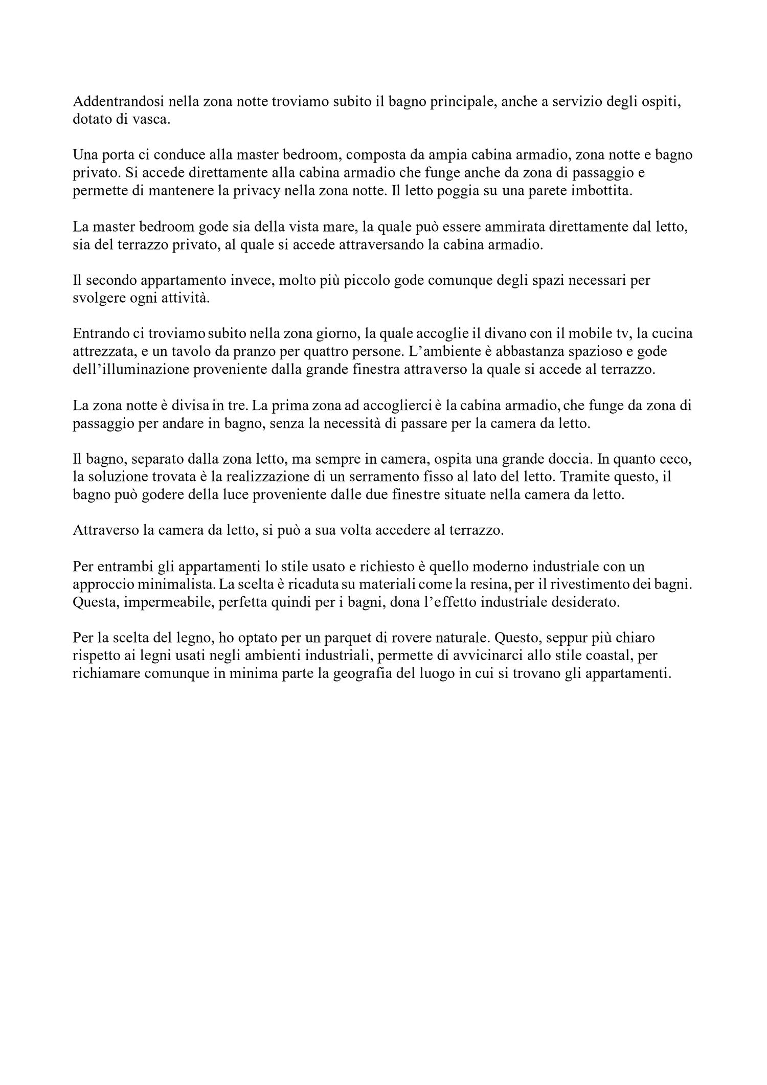 Per la scelta del legno, ho optato per un parquet di rovere naturale. Questo, seppur più chiaro rispetto ai legni usati negli ambiente industriali, permette di avvicinarci allo stile coastal, per richiamare comunque in minima parte la geografia del luogo in cui si trovano gli appartamenti.