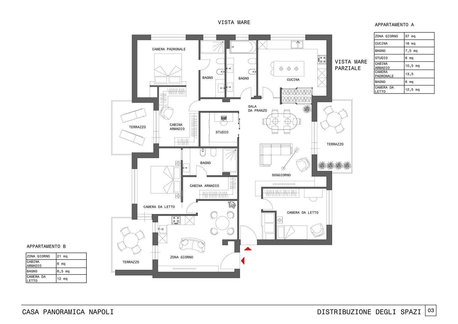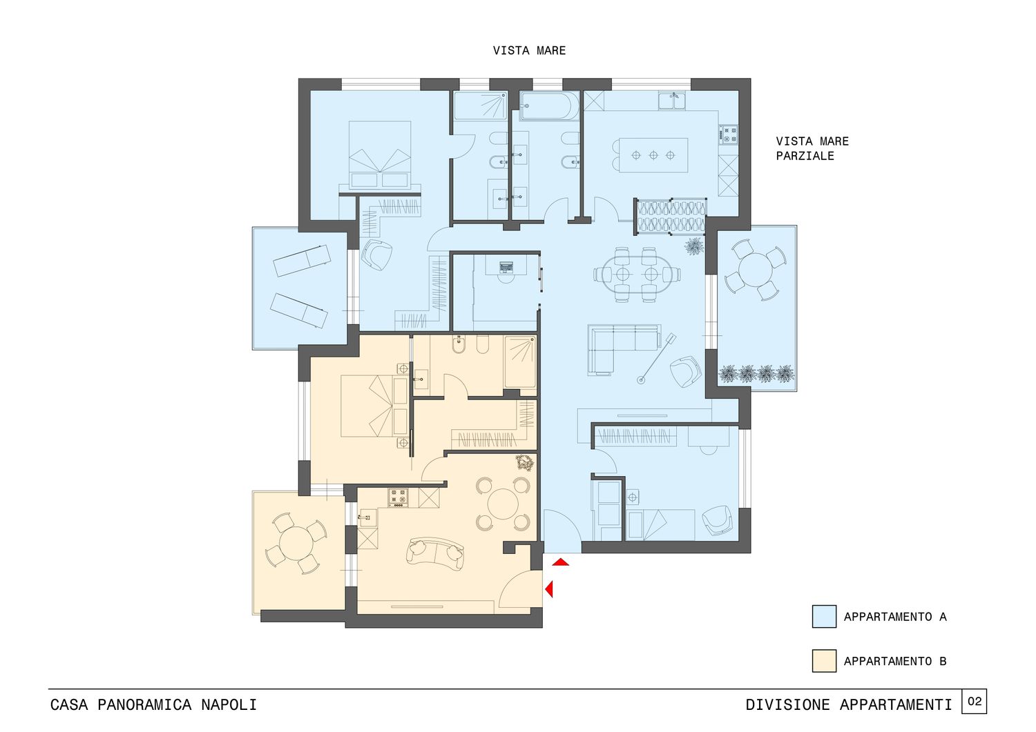 L’appartamento A, il più grande, sarà adibito a casa principale per un nucleo familiare composto da 3 persone, due adulti ed una bambina di 3 anni. La richiesta fondamentale avanzata della committenza era quella di mantenere la vista mare nella zona giorno.