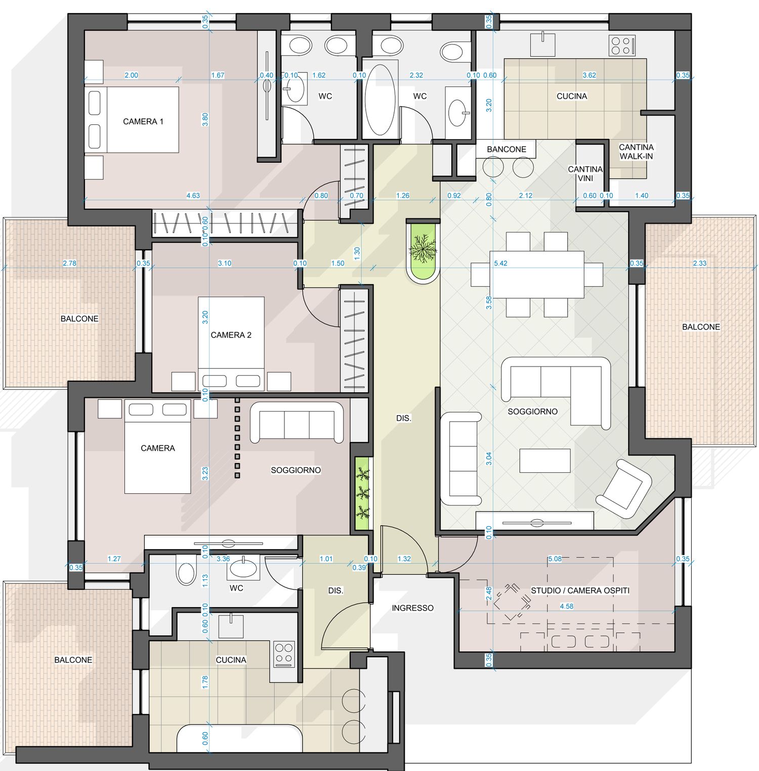 SOGGIORNO: Si riduce la larghezza del disimpegno mantenendo misure ottimali, per ottenere una maggiore superficie nella zona living. Il giardino centrale consente di separare la zona giorno dalla zona notte e di creare un filtro visivo tra l’ingresso e il bagno.