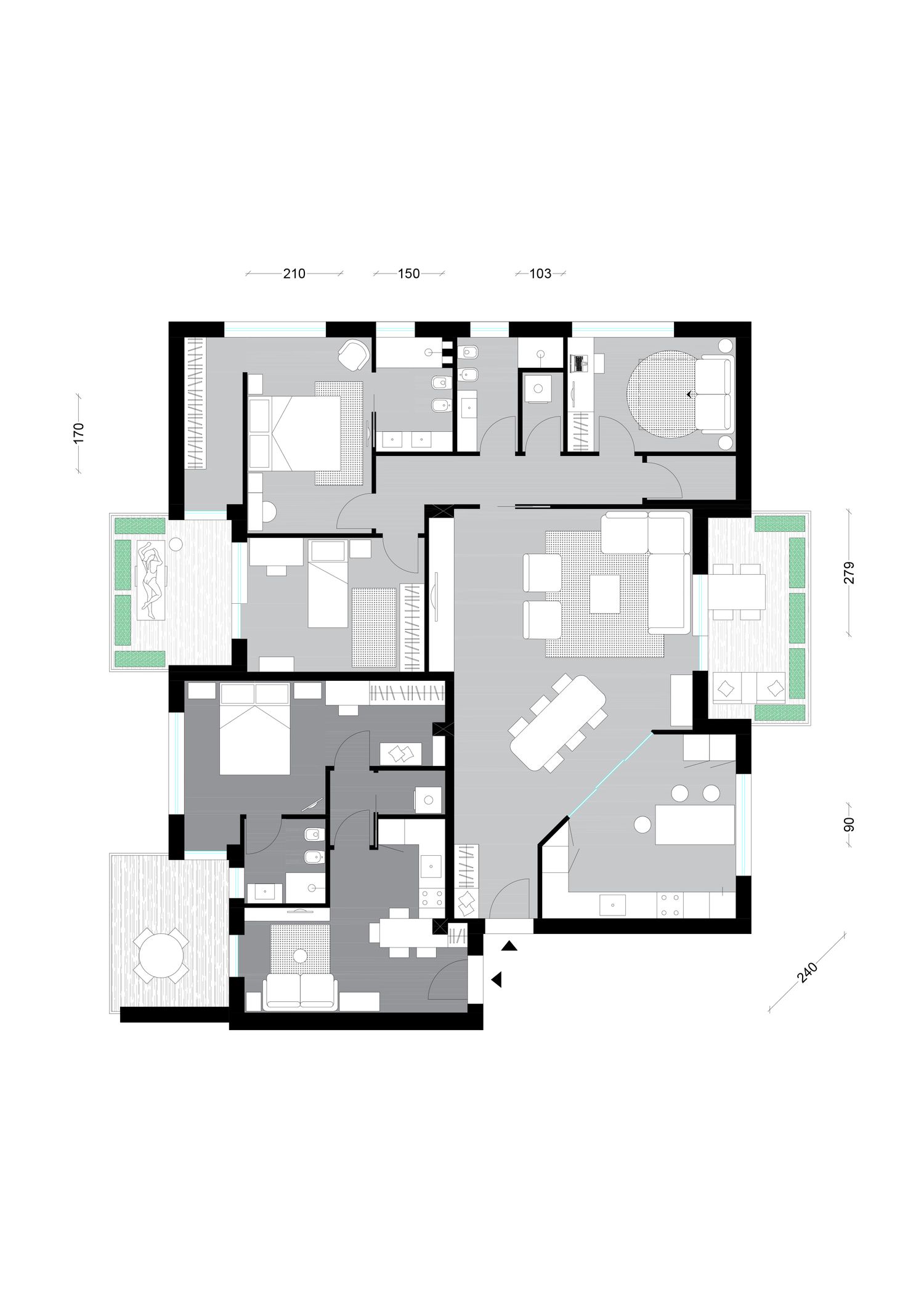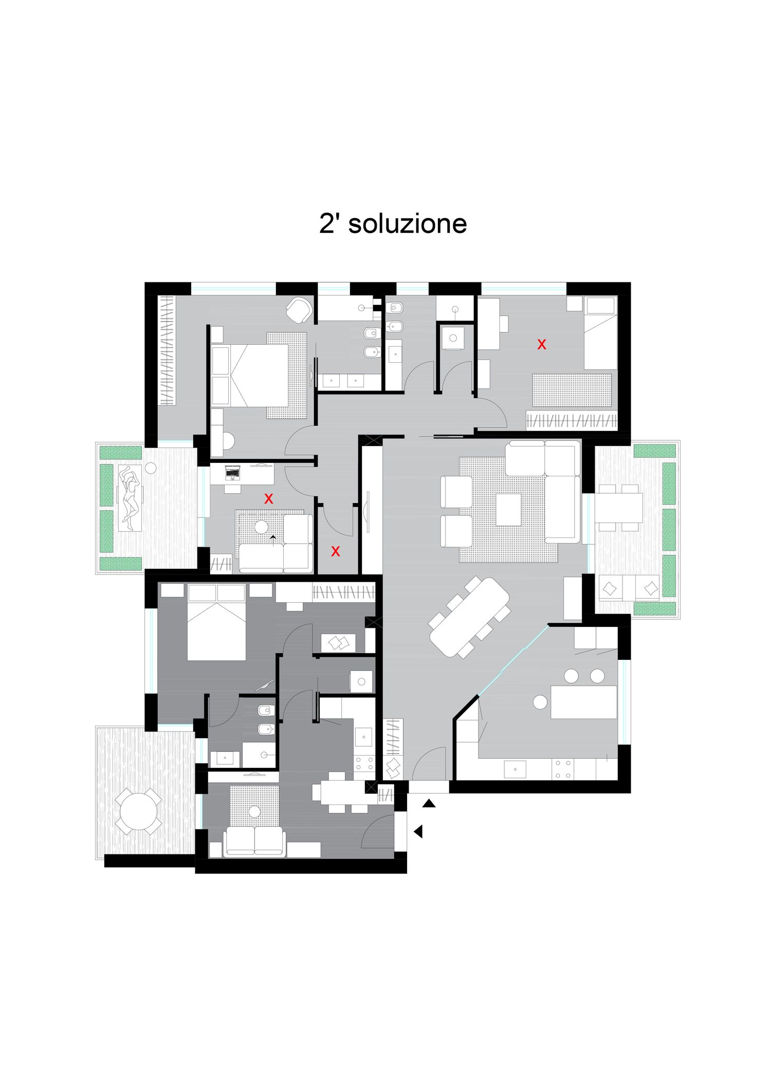 L' appartamento più piccolo è stato pensato in previsione anche della possibilità di un affitto lungo, da lì la necessità di inserire un ripostiglio con lavatrice e arredi completi. Turisti, studente o lavoratori insomma. Il divano nel living può essere anche divano letto, quindi 4 posti. Nel caso ripensaste al bagno con accesso da camera da letto, una piccola modifica con creazione di antibagno sarebbe possibile. Per quello grande: gli ingressi sono opposti alla vista mare totale, quindi una zona giorno che affacciasse lì sarebbe stata poco funzionale, ho preferito usare meglio gli spazi e lasciare la stanza studio/ospiti nella zona notte, anche in previsione di un secondo figlio, non solo perchè fosse comoda per accedere al bagno. Un ripostiglio lavanderia ed un altro li trovavo necessari per le comodità di una famiglia. Dai files risulta comunque una parziale vista mare dal terrazzo che vi ho incluso nella zona giorno, spero basti per goderne. 2' soluzione invertiti camera bimba e studio. Saluti