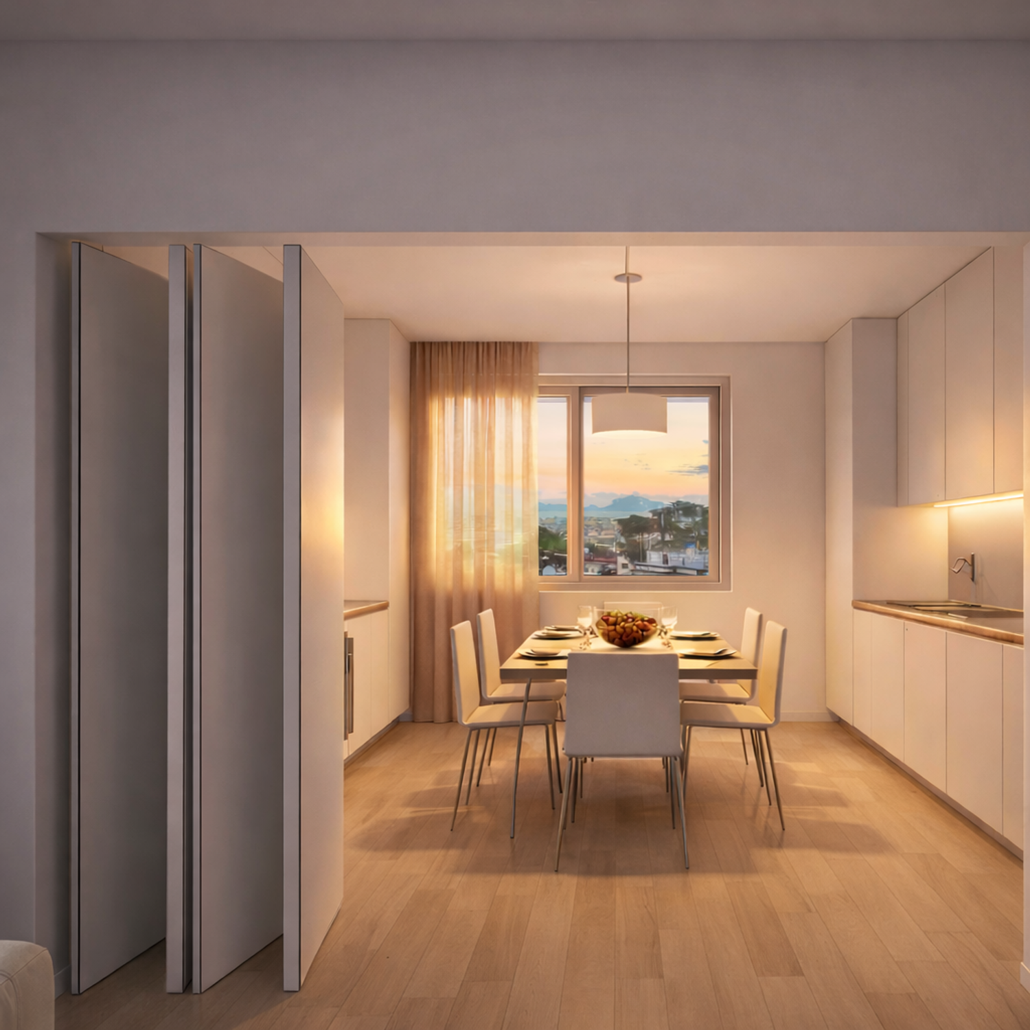L'appartamento 1 che costituisce abitazione principale è composto da ingresso, disimpegno che conduce al bagno comune e ad una stanza pluriuso (camera ospiti o studio in base alle esigenze), soggiorno con balcone e cucina separata come richiesto con vista sul mare, disimpegno, camera per bambini, camera padronale con balcone con bagno en-suite e cabina armadio