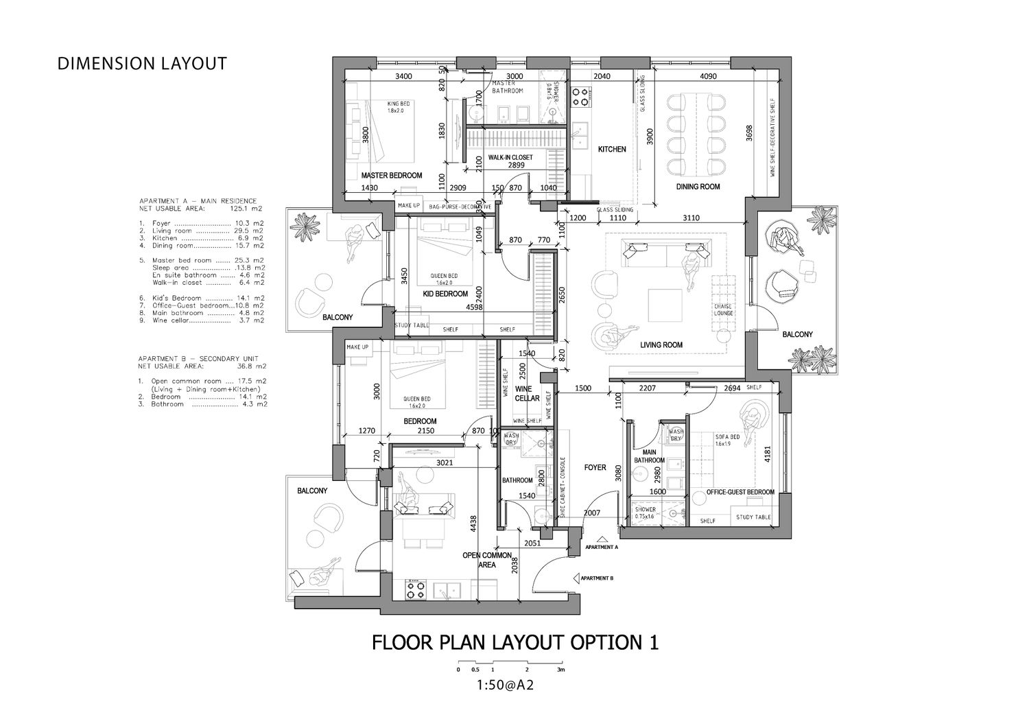 For Apartment A, the master bedroom layout is improved, with the bathroom directly connected to the walk-in closet. The kitchen is more discreetly integrated within the dining area, creating a more cohesive and refined space.