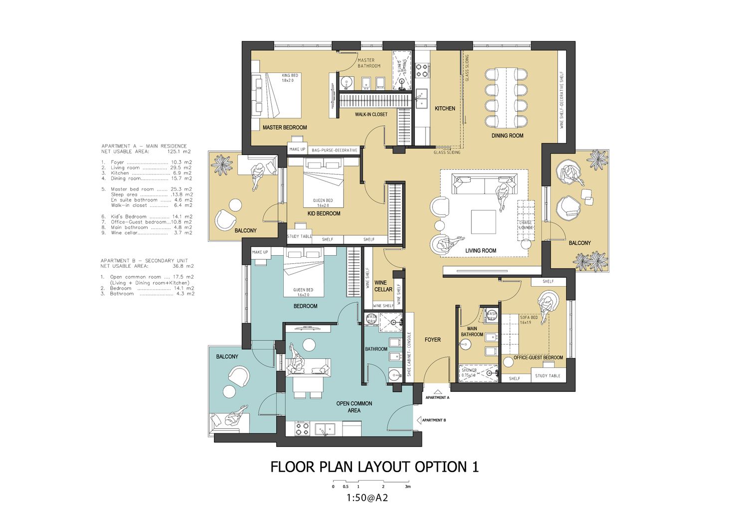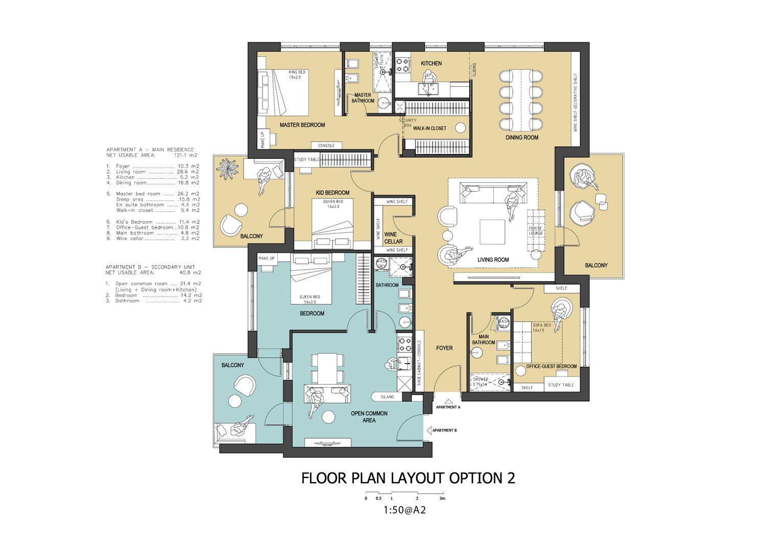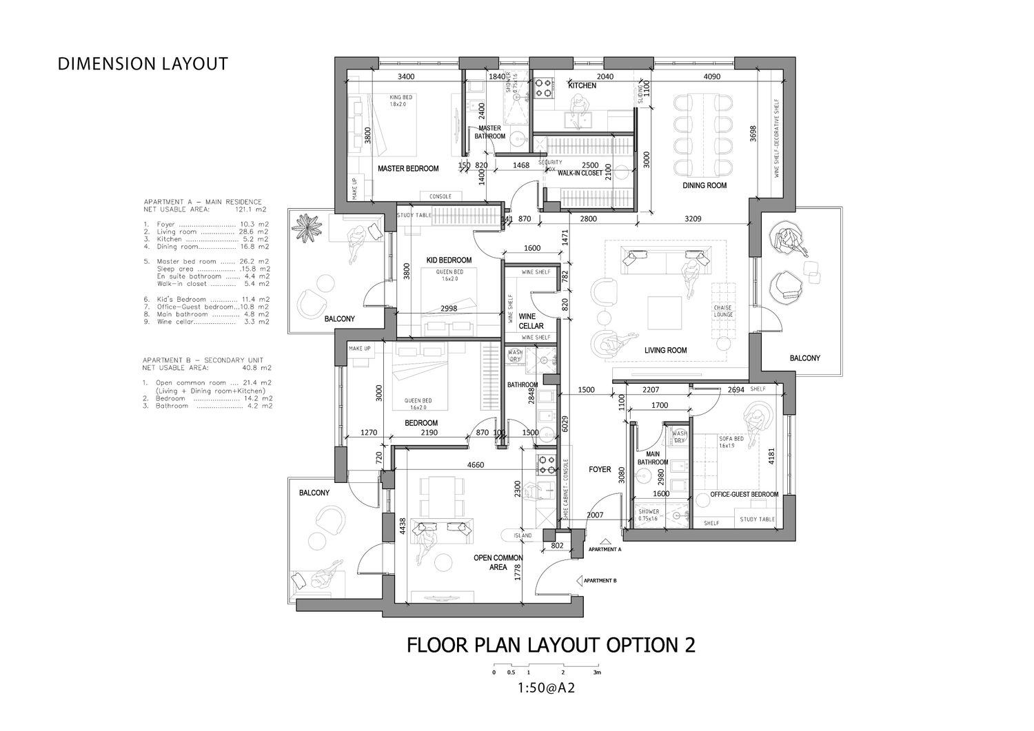 Apartment A has a reasonable usable area, while Apartment B is larger. Compared to OPTION 1, this layout provides a more generous and practical space for the rental apartment, including a larger common area, making it easier to rent out and potentially increasing rental value.