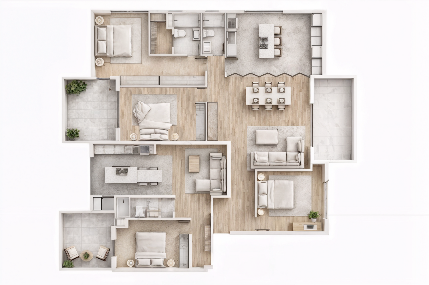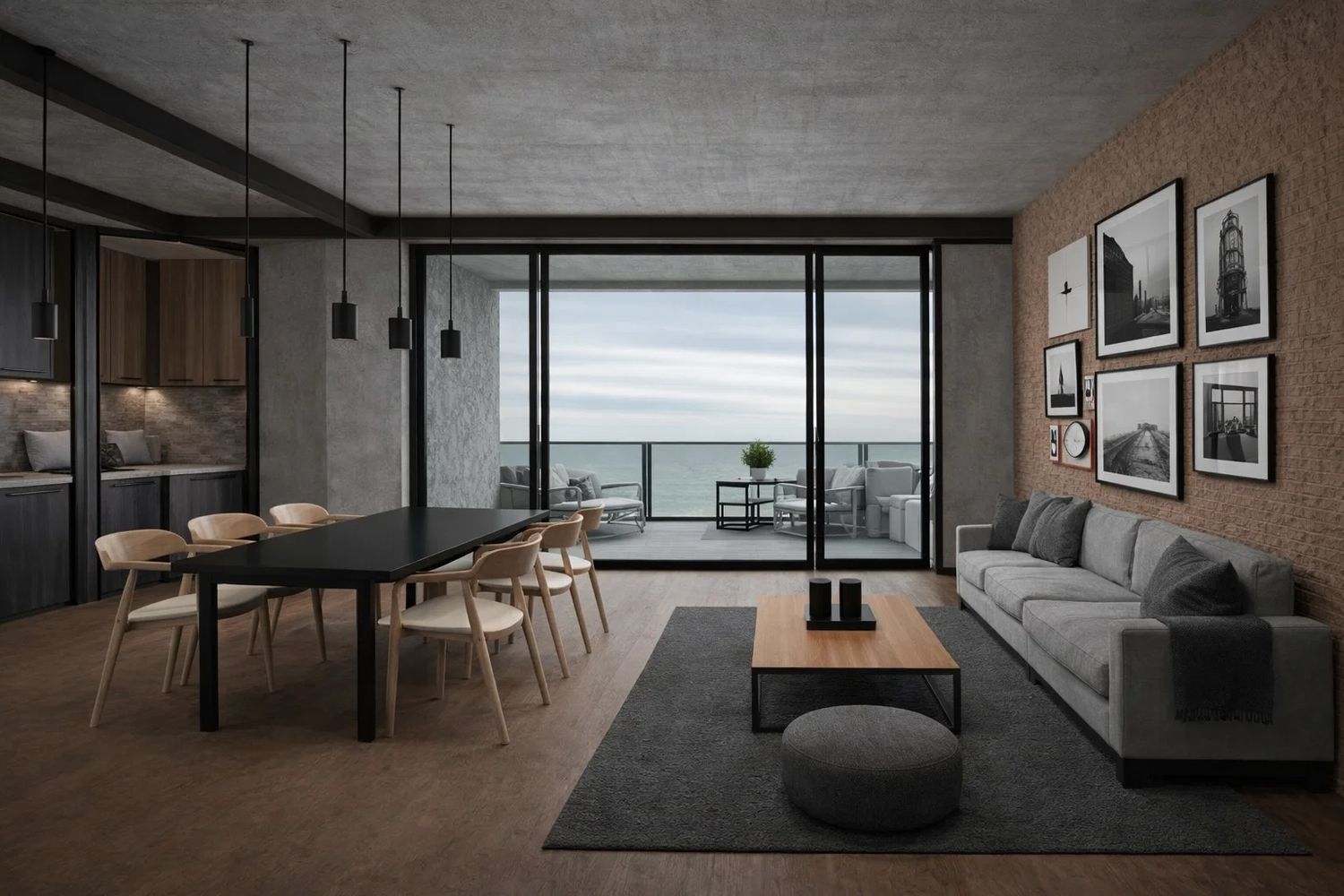 The main apartment features a guest room or study located near the entrance, leading into the social areas. The living room opens directly onto the balcony, while the kitchen faces a large window with ocean views. A foldable glass partition separates these two spaces, allowing them to function either as an open-plan area—enhancing natural light and spatial continuity—or as independent zones to contain kitchen odors when closed. Both the main bedroom and the children’s bedroom enjoy direct access to the secondary balcony.