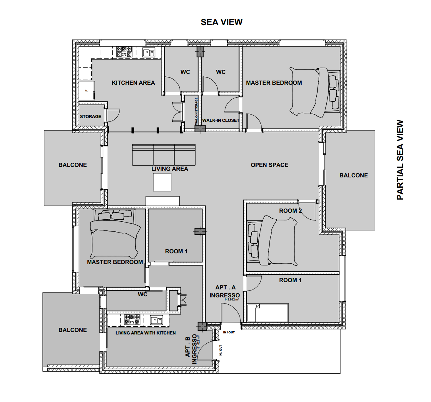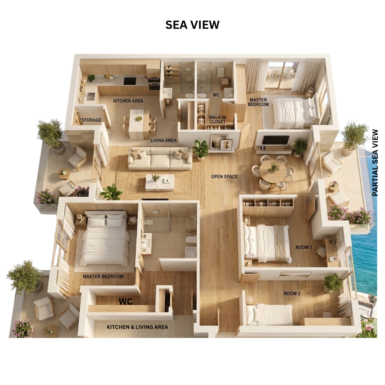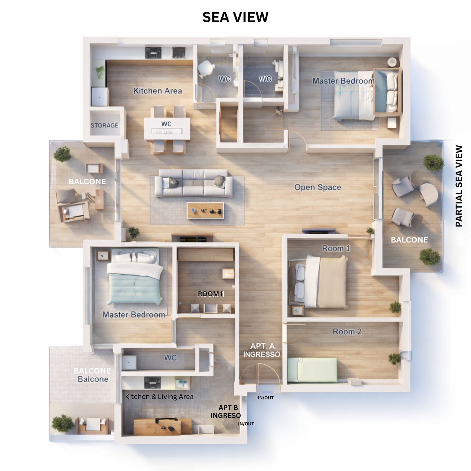 This modern Italian coastal apartment blends elegant simplicity with a warm seaside atmosphere. The layout follows an open and functional plan, where natural light and sea views define every space. Upon entering through the Ingresso, residents are welcomed by a bright living area connected seamlessly to the open kitchen and dining space. The interior combines wood flooring, beige tones, and minimalist furniture, creating a refined Mediterranean charm. Each bedroom is designed for comfort, featuring soft linens, wardrobes, and large windows. The master suite includes a walk-in closet and private bathroom, while the open space extends to balconies overlooking the sea. Outdoor areas are furnished with lounge chairs and plants, offering a relaxing connection to nature. With clean lines, natural textures, and a calm coastal palette, the apartment reflects modern Italian elegance and the serenity of life by the sea.