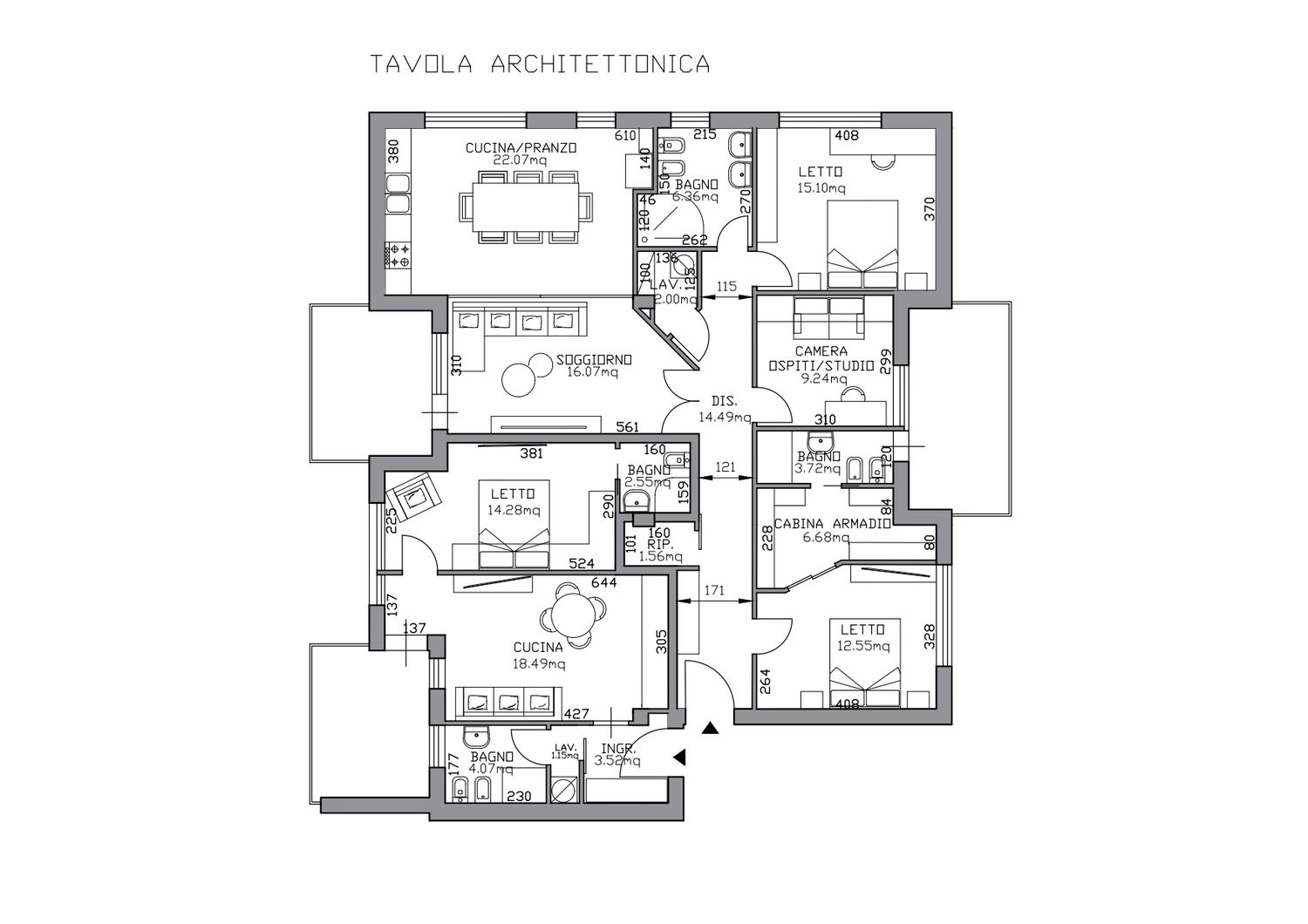 L’abitazione principale racconta invece una visione più ampia del vivere. Il corridoio non è un semplice spazio di passaggio, ma un elemento organizzativo che rende la casa efficiente e ordinata. Qui trovano posto un comodo ripostiglio, ideale per mantenere tutto in perfetto assetto, e una stanza lavanderia dedicata, un vero lusso contemporaneo che permette di concentrare in un unico ambiente lavatrice, asciugatrice e zona stiro, liberando il resto della casa da ingombri e rumori. La zona notte si sviluppa in ambienti generosi e versatili: la prima camera, di 12 mq, è completata da una cabina armadio di 6 mq che conduce al bagno finestrato in camera, creando una suite intima e raffinata. Lo studio, attrezzato con armadiatura a ponte e divano letto integrato, è uno spazio trasformabile, perfetto per lo smart working ma pronto ad accogliere ospiti con eleganza. La terza camera, di 15 mq, offre ampiezza e flessibilità, adattandosi nel tempo alle esigenze di una famiglia, anche con due figli.