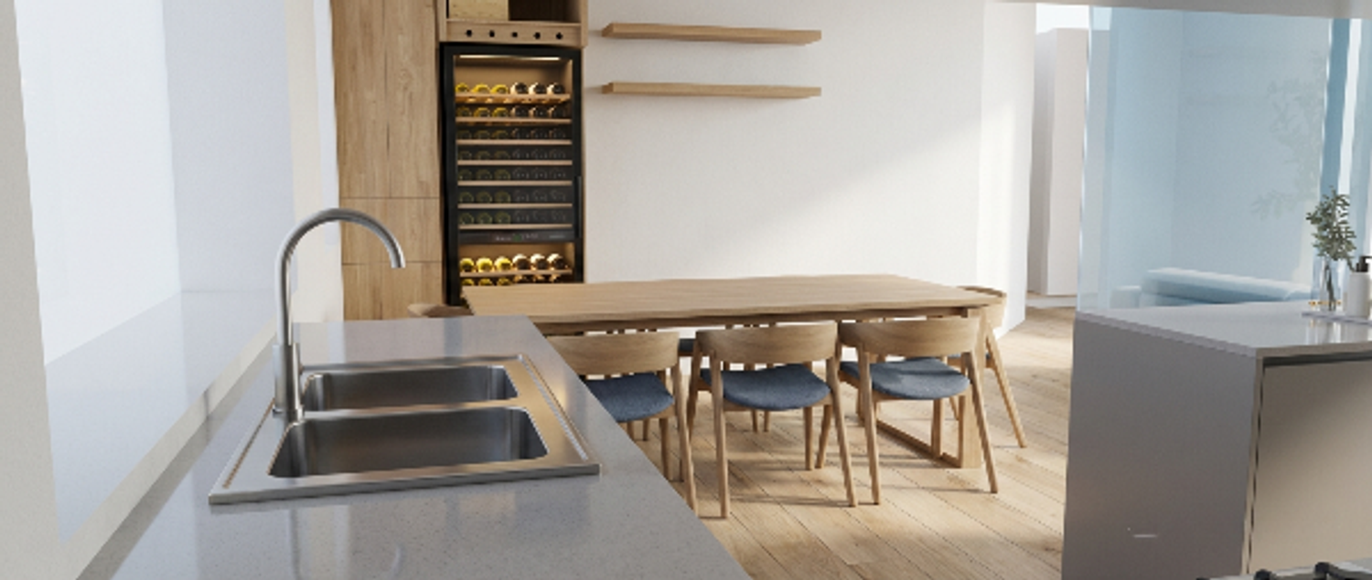 Il cuore della casa è la zona giorno, luminosa e accogliente, pensata per essere vissuta ogni giorno. Il soggiorno dialoga con l’area cucina e pranzo attraverso divisori in legno e vetrate scorrevoli che lasciano filtrare la luce mantenendo una separazione funzionale: un equilibrio raffinato tra apertura e privacy, tra convivialità e comfort. La cucina è ampia e scenografica, dotata anche di isola, diventa punto di incontro naturale della famiglia. Di fronte, incassata nella parete, una cantina vini a tutta altezza aggiunge un elemento distintivo, capace di trasformare un ambiente funzionale in uno spazio di carattere.
