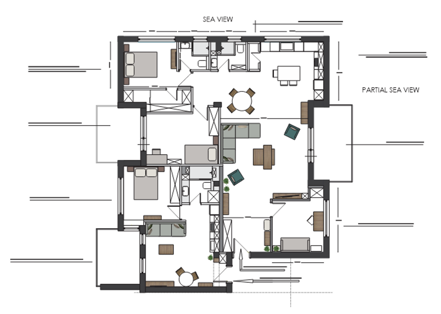 The division of the apartment into two distinct units was undertaken in response to the initial project brief. The original structure’s two entrance points have been retained, with each entrance serving a specific function: the smaller entrance, situated to the left of the plan, is intended for commercial use, whilst the larger entrance to the right provides access to the family’s living space, allowing them to benefit from both direct and partial views of the sea.