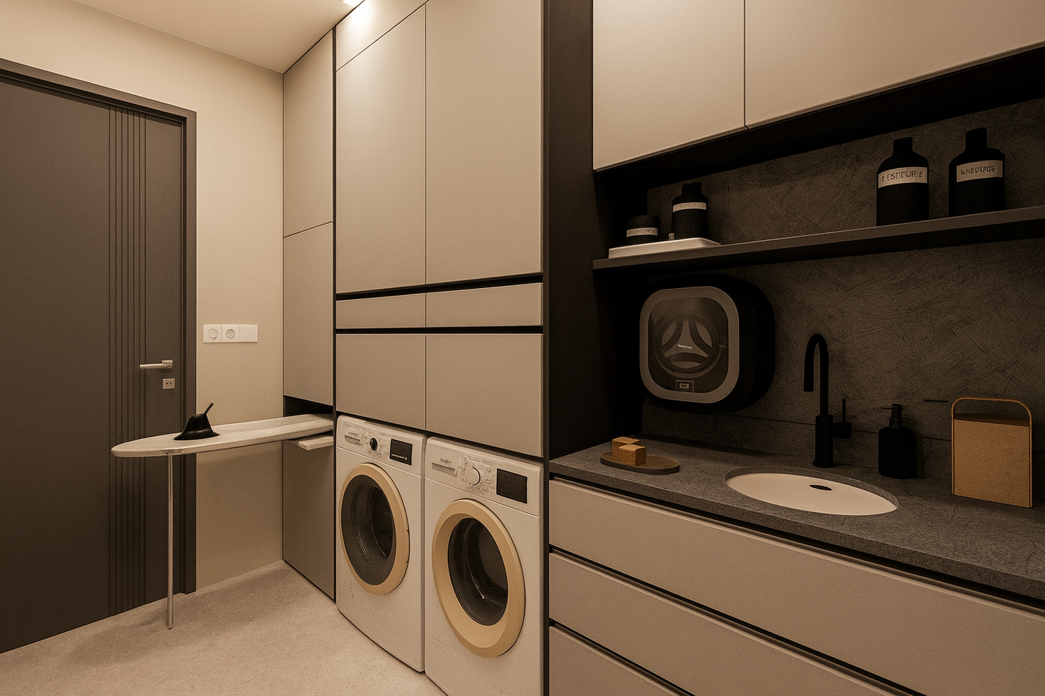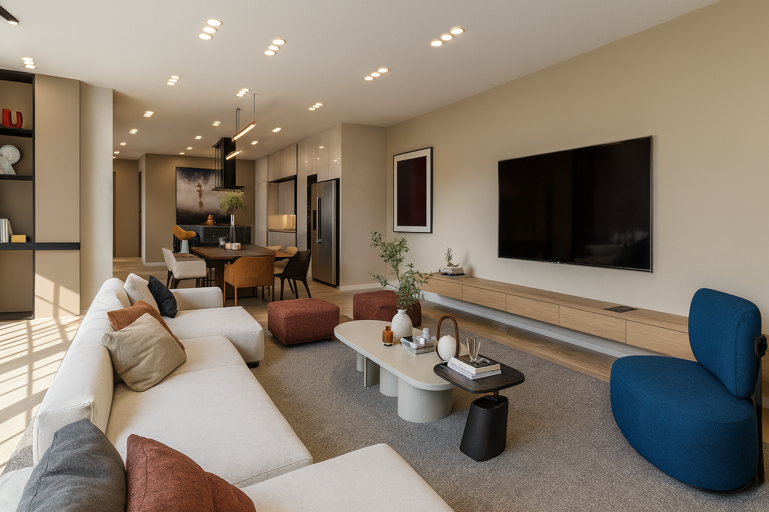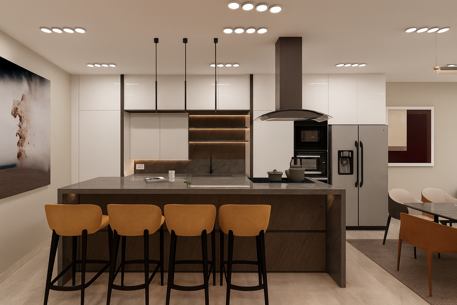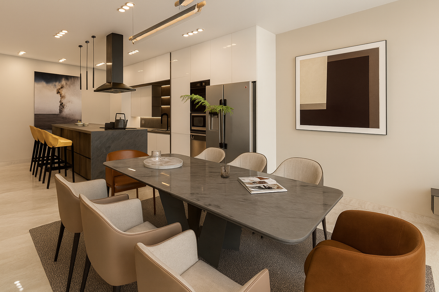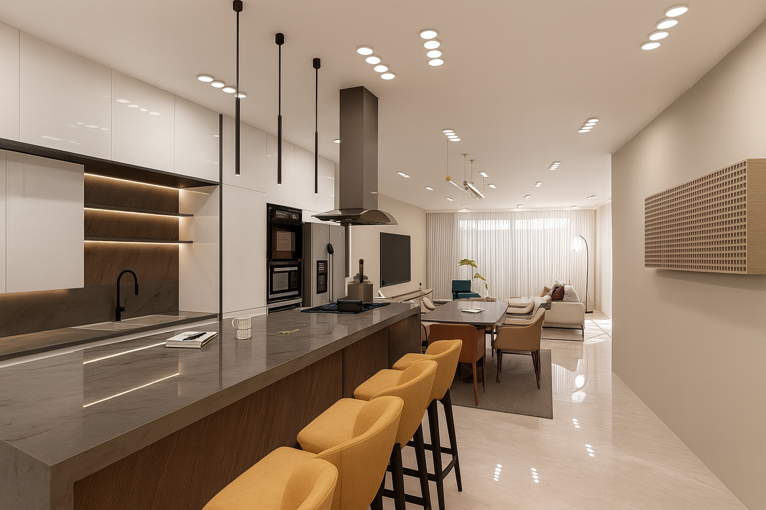 - Cucina, sala da pranzo e soggiorno sono integrati in una forma allungata, creando un moderno open space.