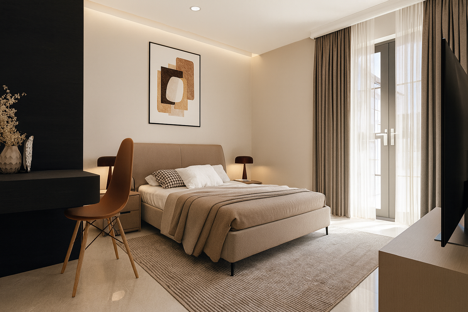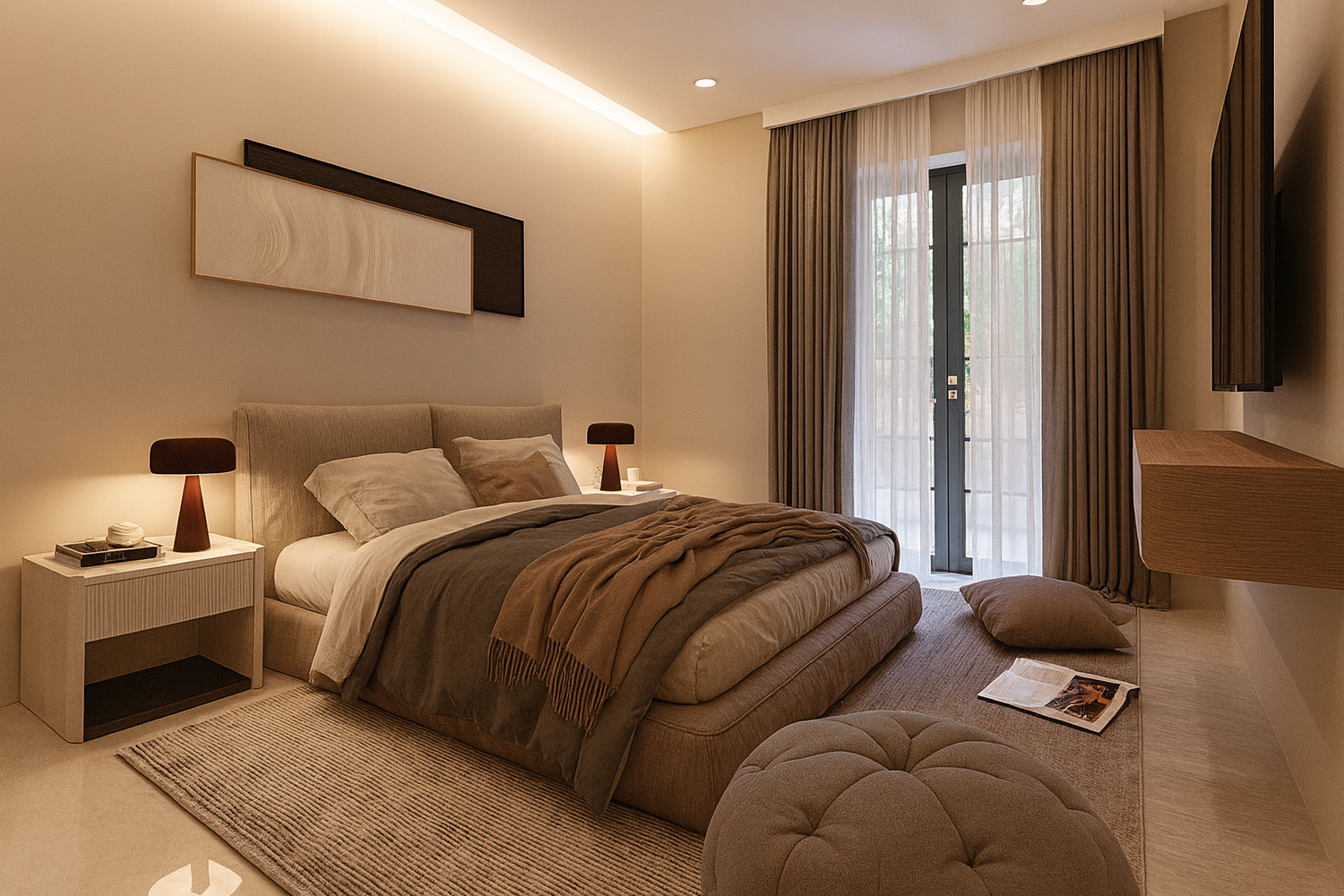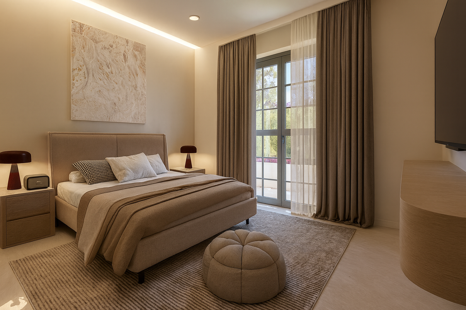 - La camera da letto principale ha un accesso diretto alla zona giorno (soggiorno).