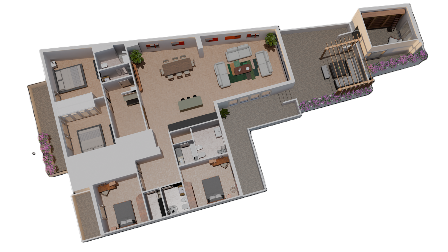 Il cuore conviviale dell’abitazione è un ampio soggiorno open space che riunisce cucina, sala da pranzo e area living. La cucina con isola è stata concepita come luogo funzionale e conviviale, capace di dialogare visivamente con la zona pranzo, organizzata attorno a un grande tavolo, e con l’area living, caratterizzata da un ampio divano che si apre verso l’esterno. Questo ambiente può trasformarsi in una vera e propria sala cinema domestica grazie alla predisposizione per un proiettore frontale e a uno schermo retraibile a soffitto che, una volta abbassato, funge anche da oscurante per le finestre, creando l’atmosfera ideale per il relax e l’intrattenimento.