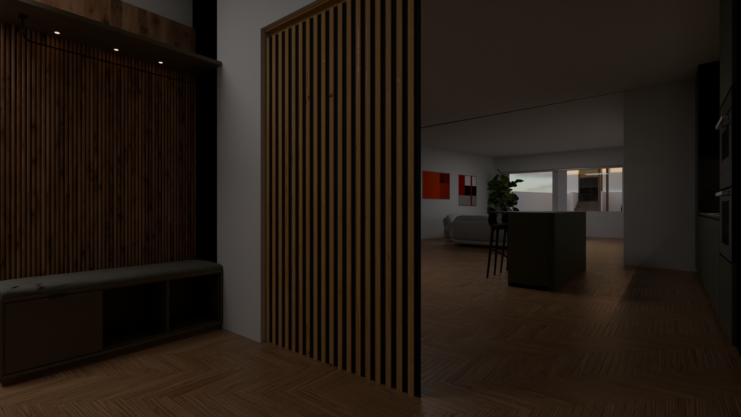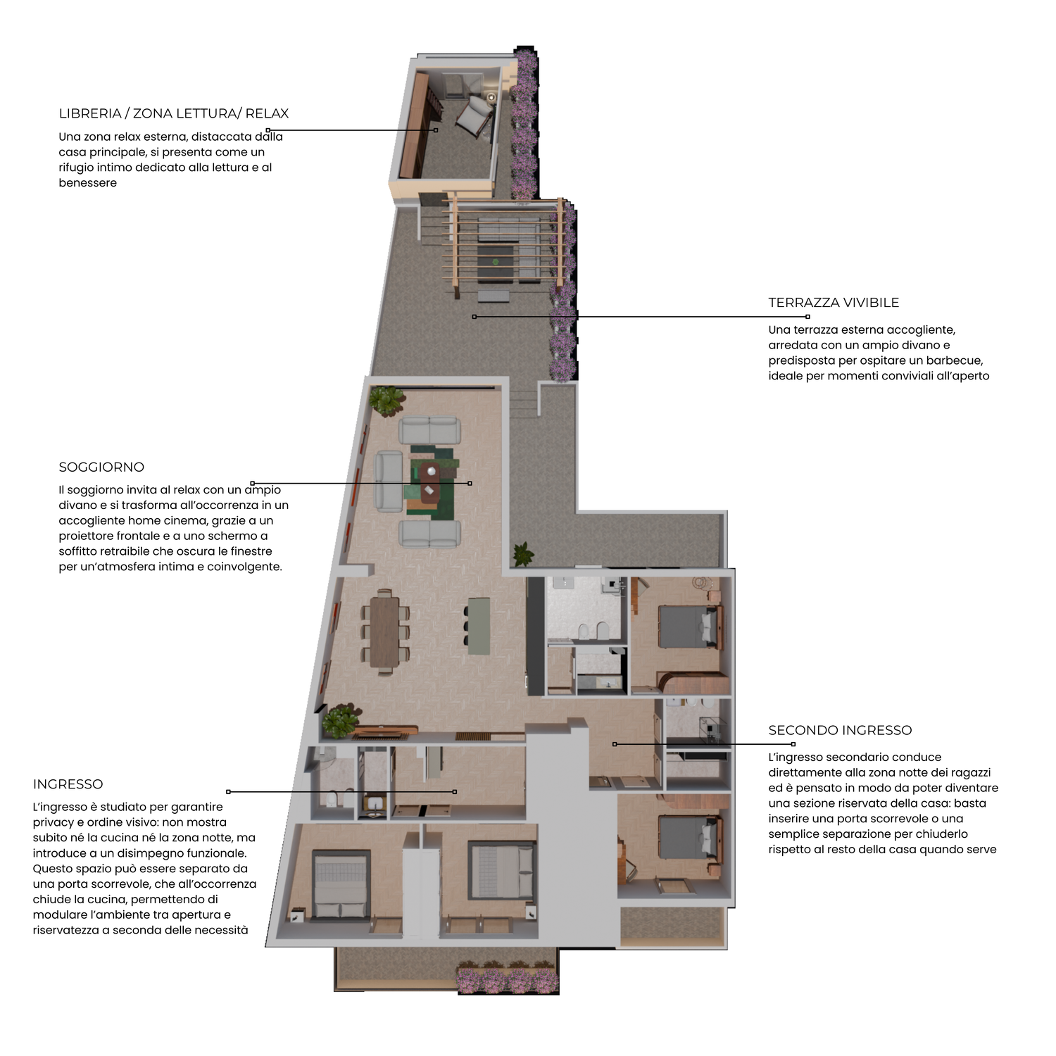 Ho progettato questa abitazione per rispondere fedelmente alle vostre esigenze, con una chiara distinzione tra le zone funzionali, gli spazi di servizio e gli ambienti dedicati al relax. La casa dispone di due accessi indipendenti: l’ingresso principale conduce direttamente alla zona giorno e introduce a un disimpegno che, schermando la vista immediata della cucina e della zona notte, garantisce ordine e privacy; questo spazio può essere chiuso all’occorrenza da una porta scorrevole, modulando la comunicazione con la cucina in base alle necessità. L’ingresso secondario, invece, porta direttamente nella zona notte dei ragazzi, pensata come area autonoma che in un futuro potrà essere separata dal resto della casa per diventare uno spazio indipendente.