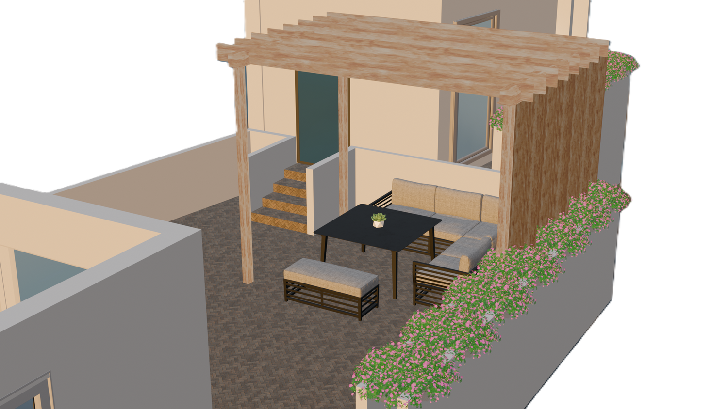 La casa si arricchisce infine di spazi esterni che diventano vere e proprie estensioni della vita domestica. Una terrazza vivibile arredata con un ampio divano è pensata per il relax, ma può facilmente ospitare un barbecue, trasformandosi in uno spazio ideale per pranzi e cene all’aperto. Poco distante, una zona relax distaccata, arredata con libreria e comoda seduta, offre un ambiente intimo e accogliente dedicato alla lettura e al benessere.