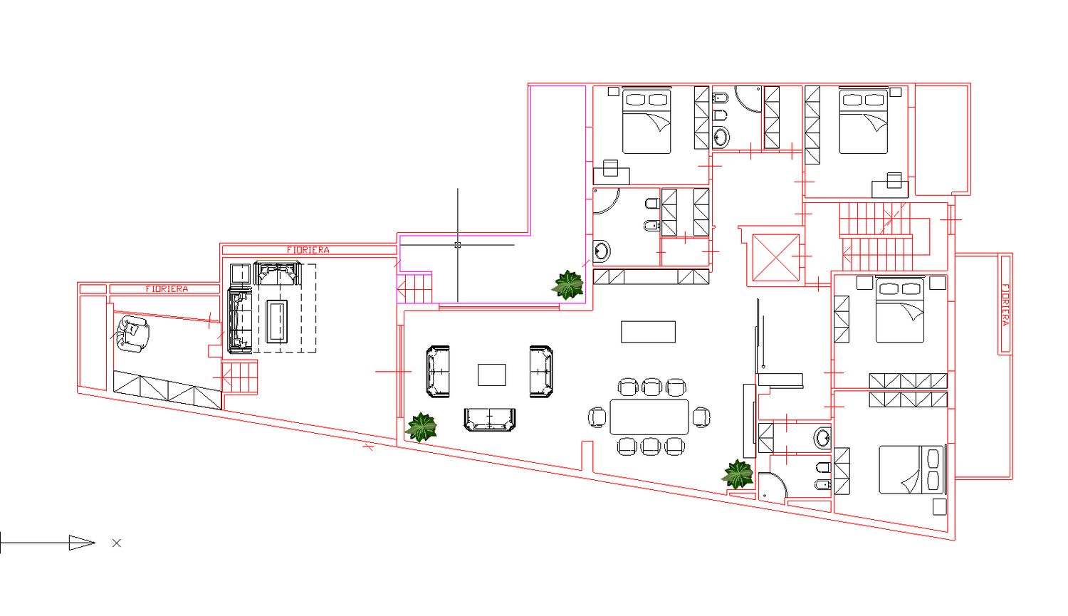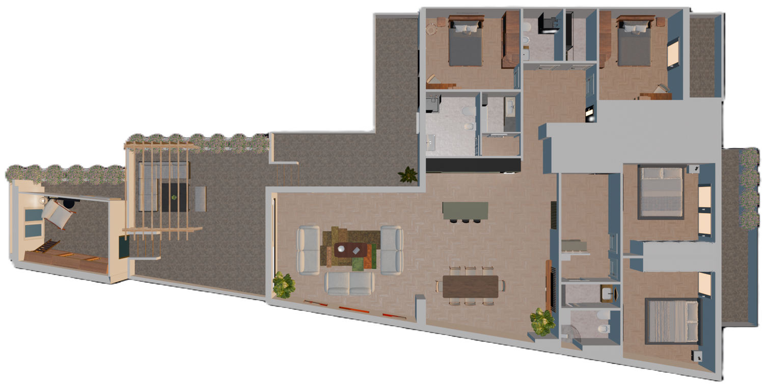 La zona notte è organizzata per garantire comfort e privacy. La camera matrimoniale è affiancata da un bagno adiacente, mentre le due camere destinate ai ragazzi, vicine tra loro, condividono un bagno dedicato. Una quarta camera, pensata come spazio flessibile, può essere adibita a stanza per gli ospiti o a studio, rendendo la disposizione versatile e adatta sia all’uso quotidiano sia a una futura suddivisione dell’abitazione in unità autonome.