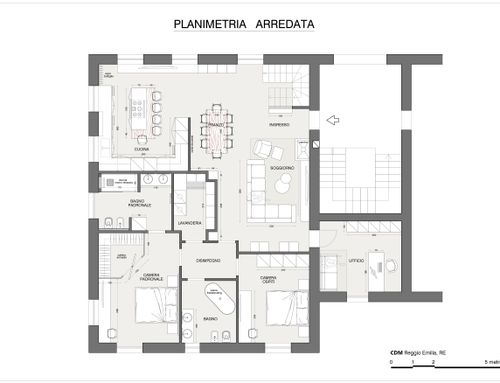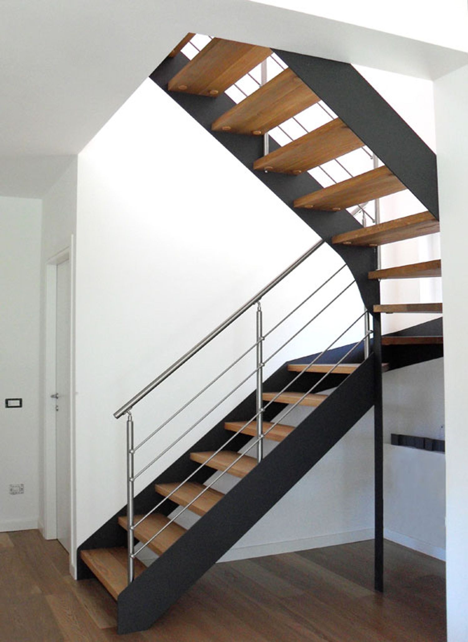 La scala che collega al piano di sopra deve essere fatta con una struttura moderna in metallo preferibilmente scuro e scalini in legno.
