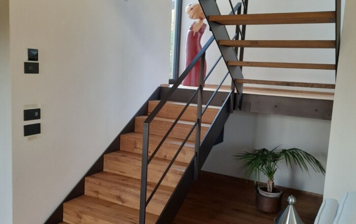 The staircase connecting to the upper floor should have a modern metal structure, preferably dark, with wooden steps.