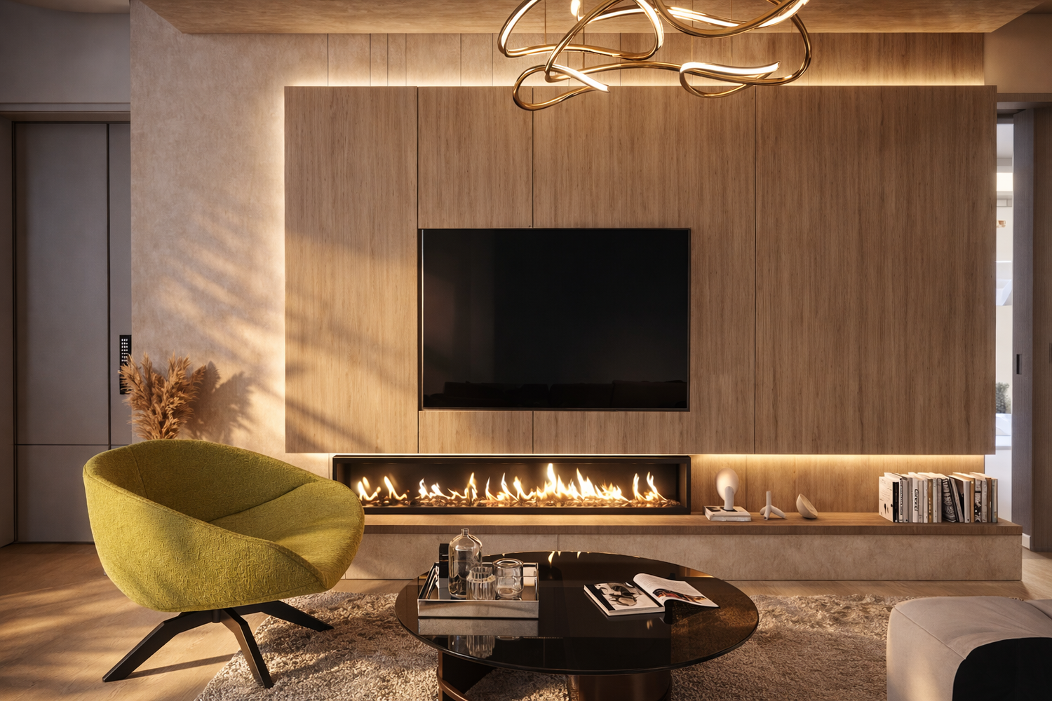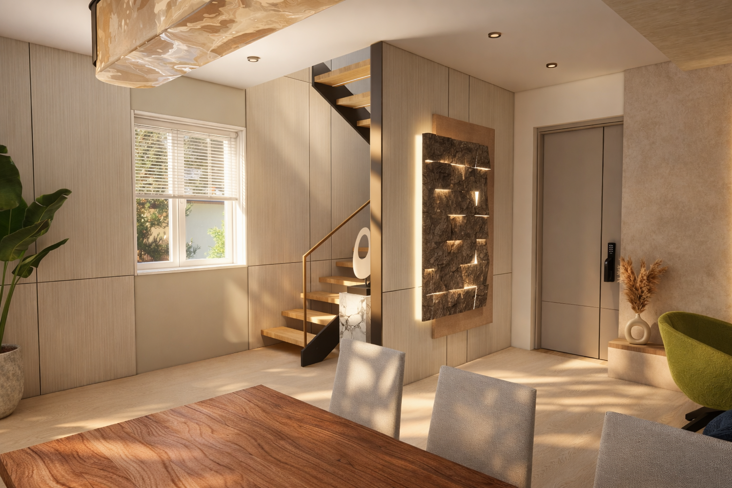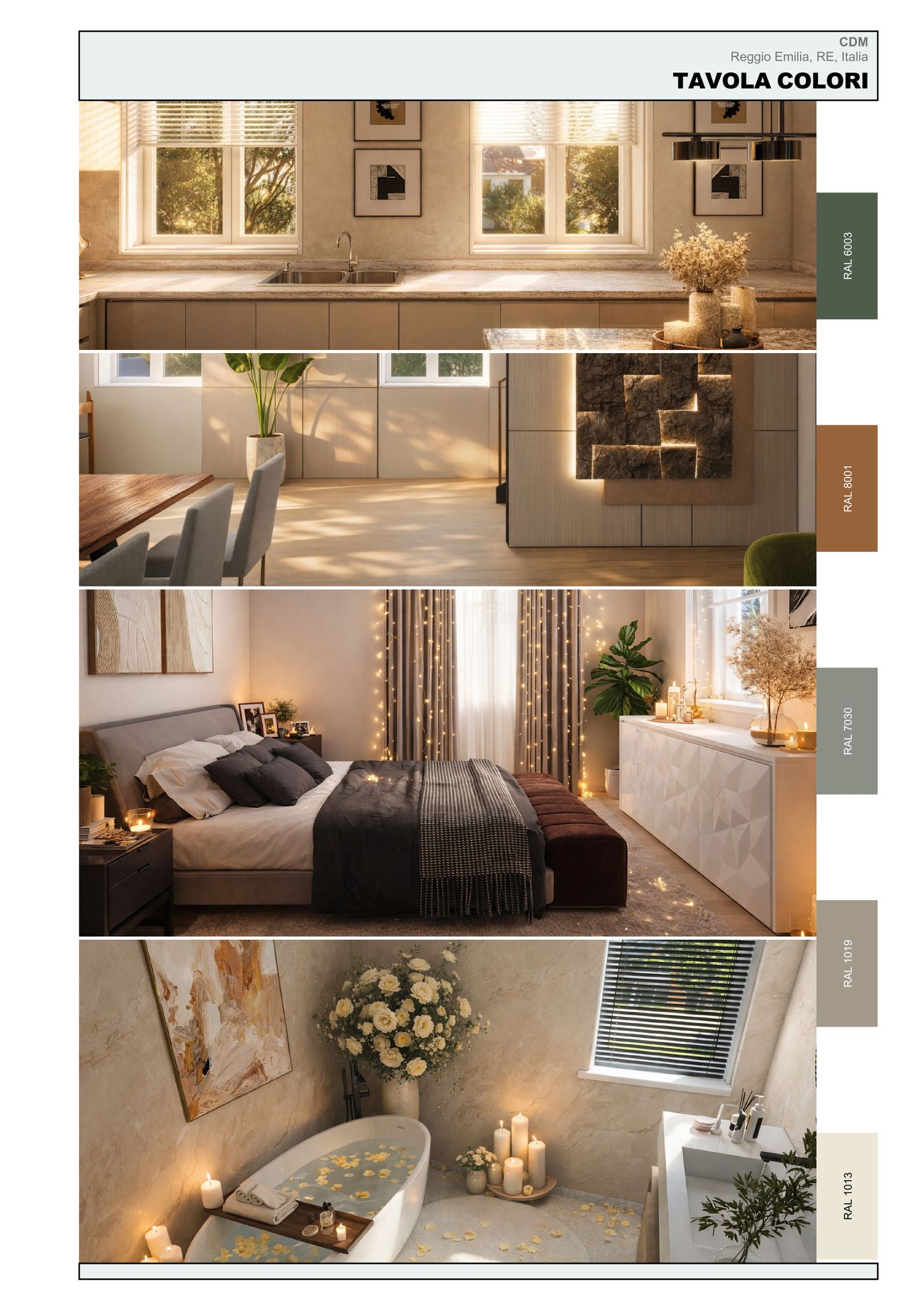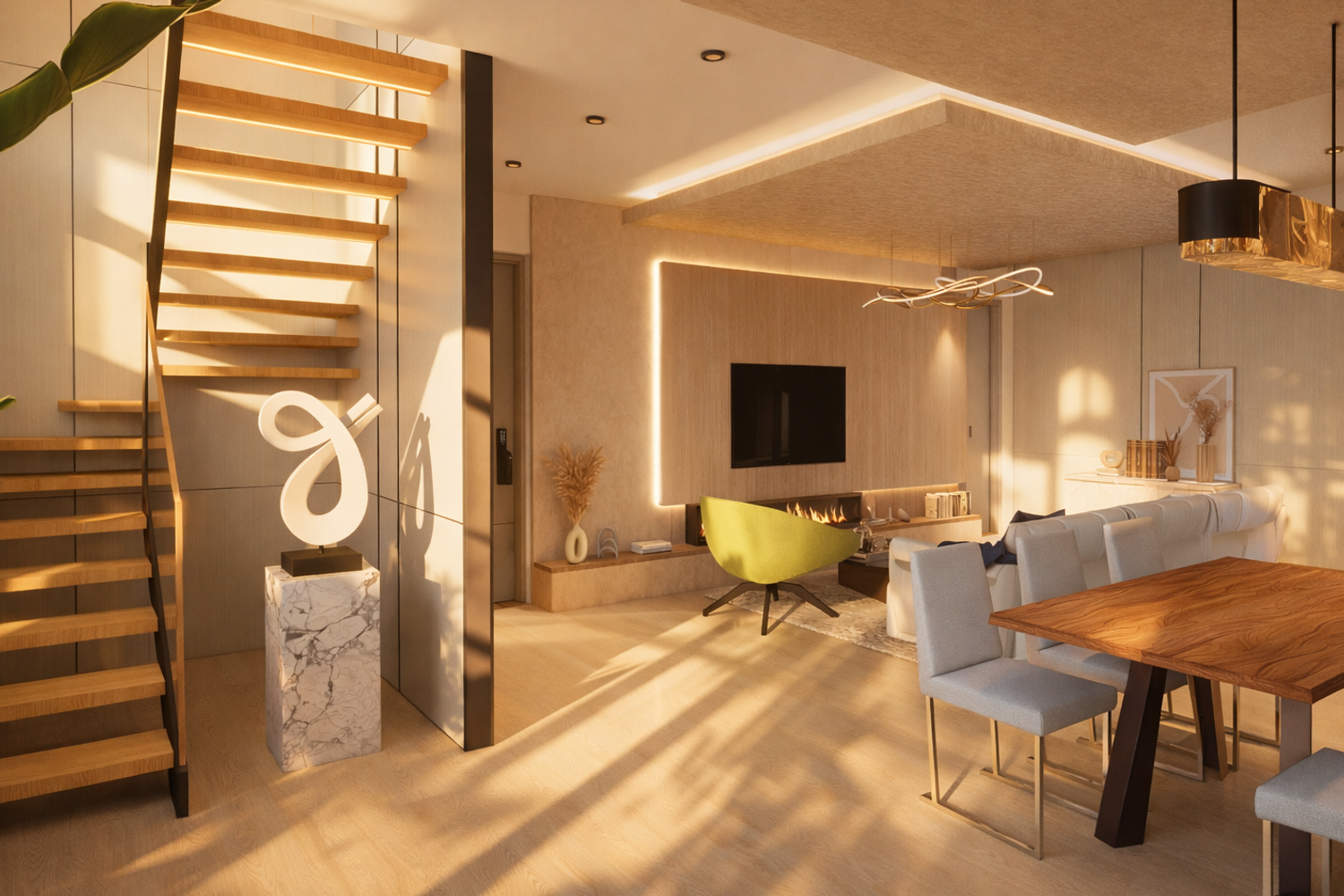 Il progetto propone un interior contemporaneo con accenti warm modern, in cui l’attenzione è posta sulla matericità: legno naturale, superfici minerali e una palette neutra e calda, completate da un’illuminazione ambientale stratificata.