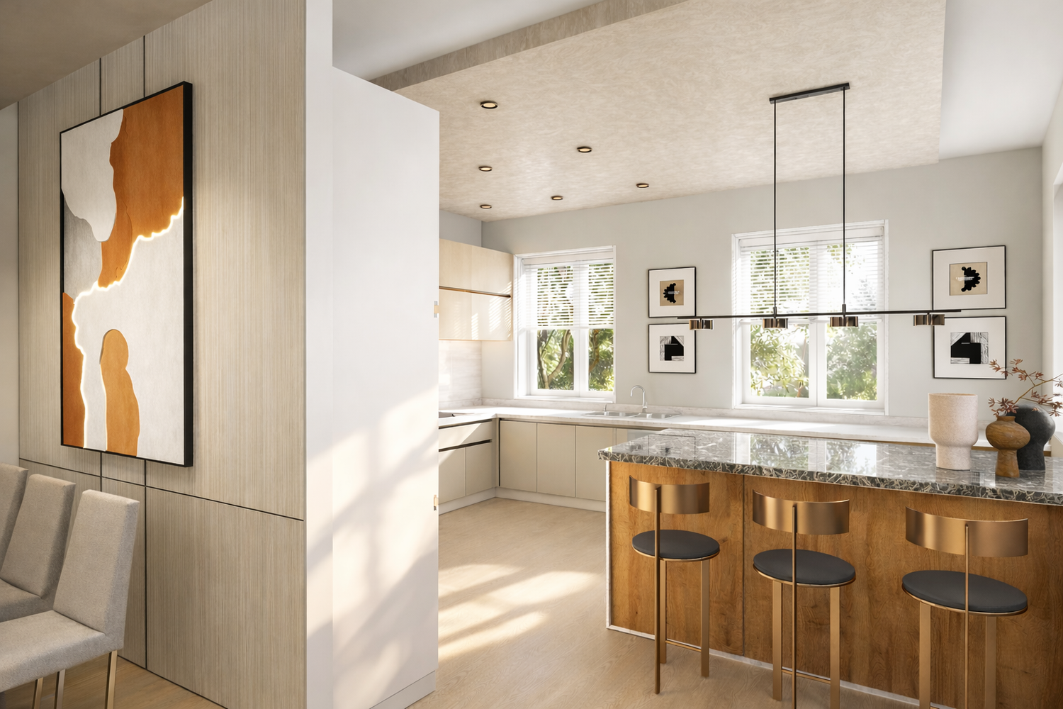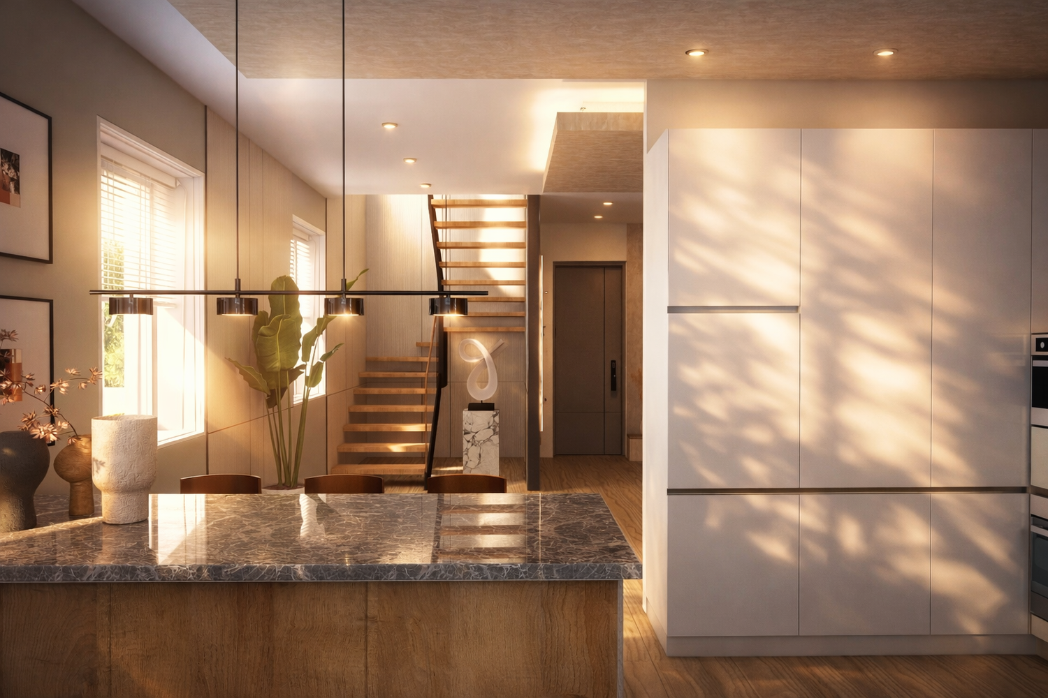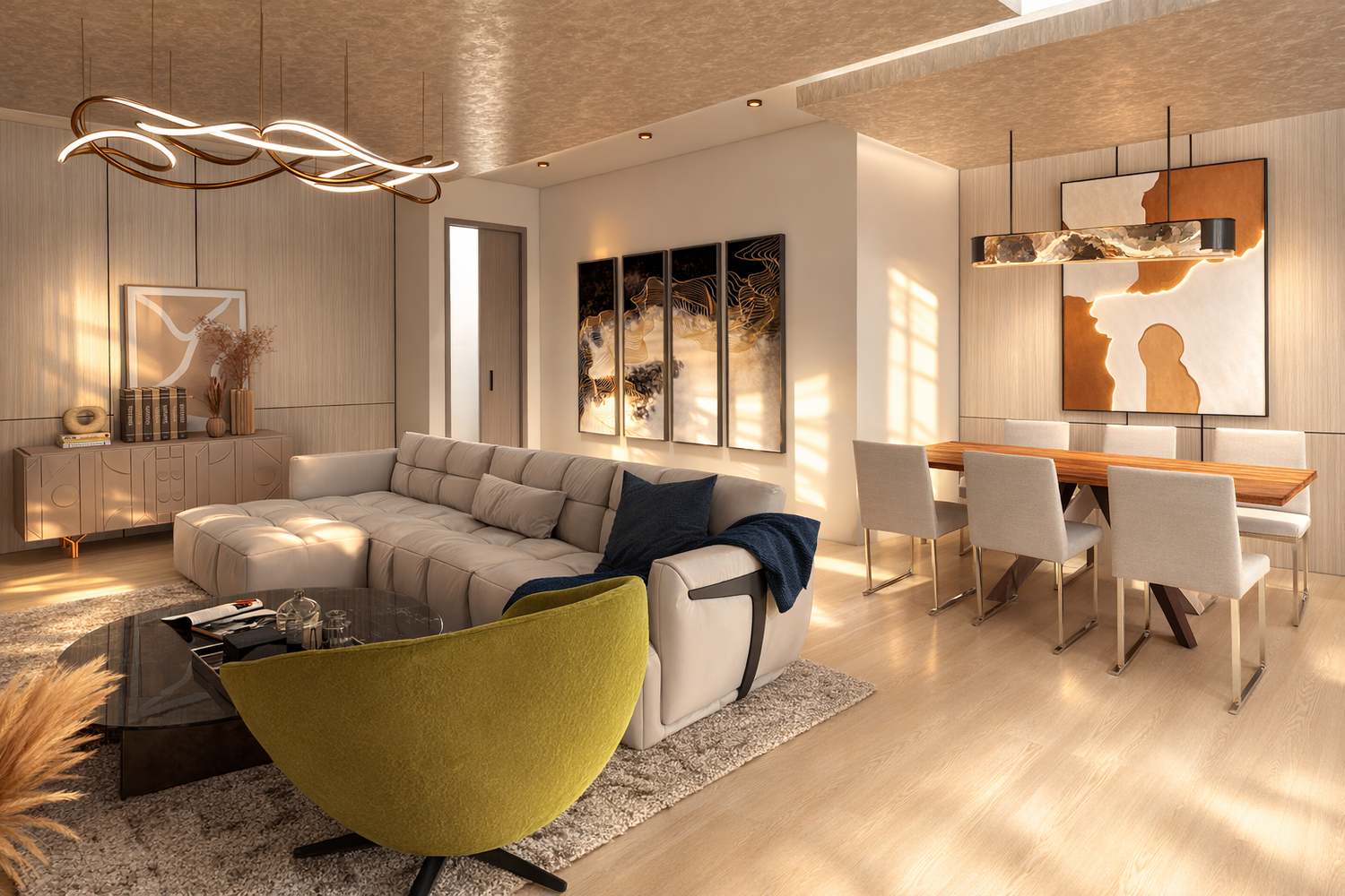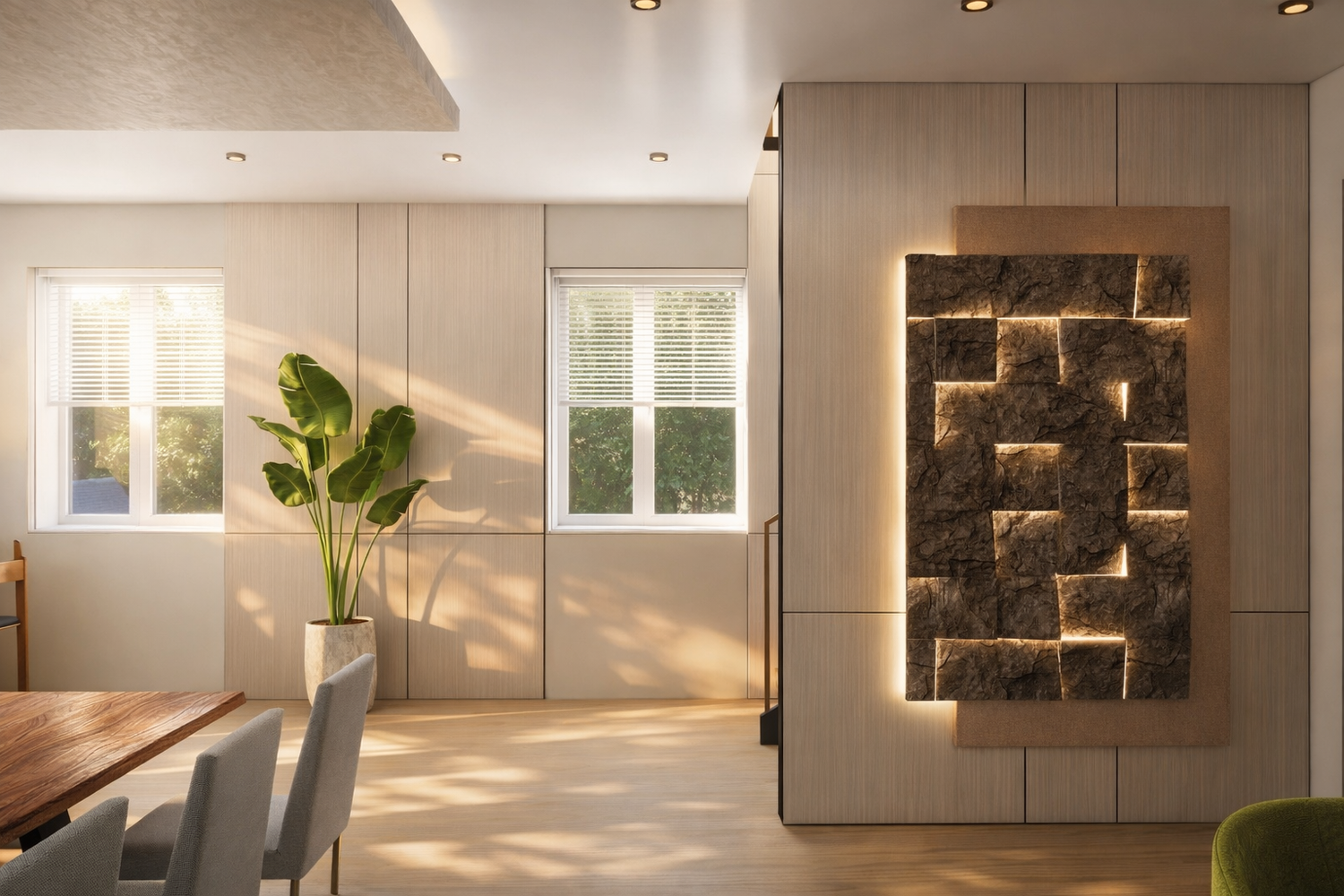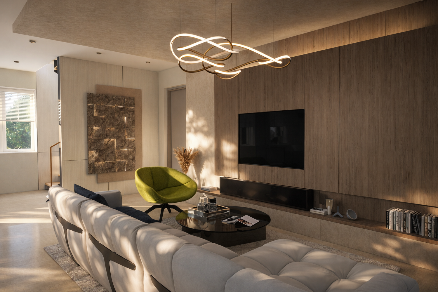 Il progetto propone un interior contemporaneo con accenti warm modern, in cui l’attenzione è posta sulla matericità: legno naturale, superfici minerali e una palette neutra e calda, completate da un’illuminazione ambientale stratificata.