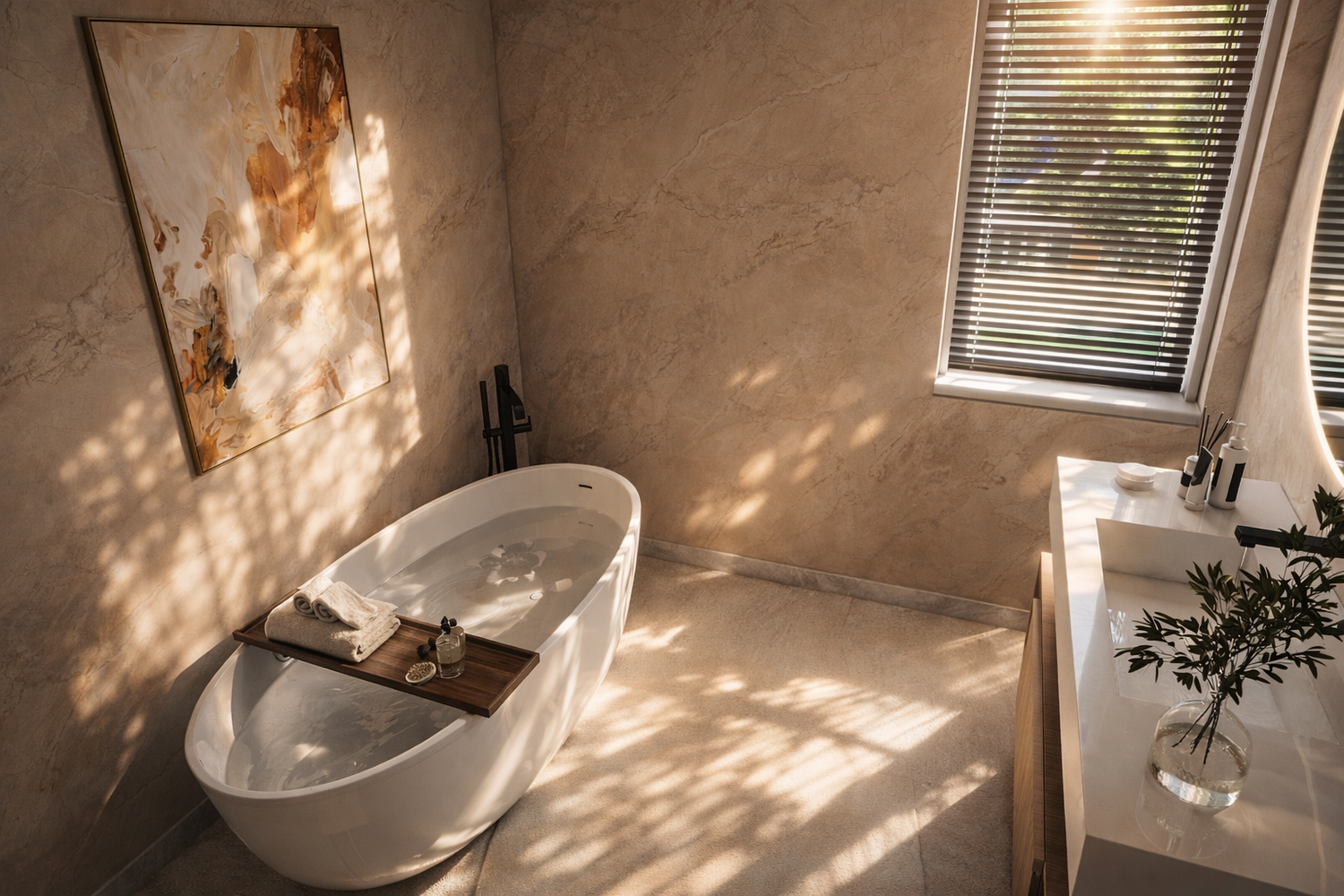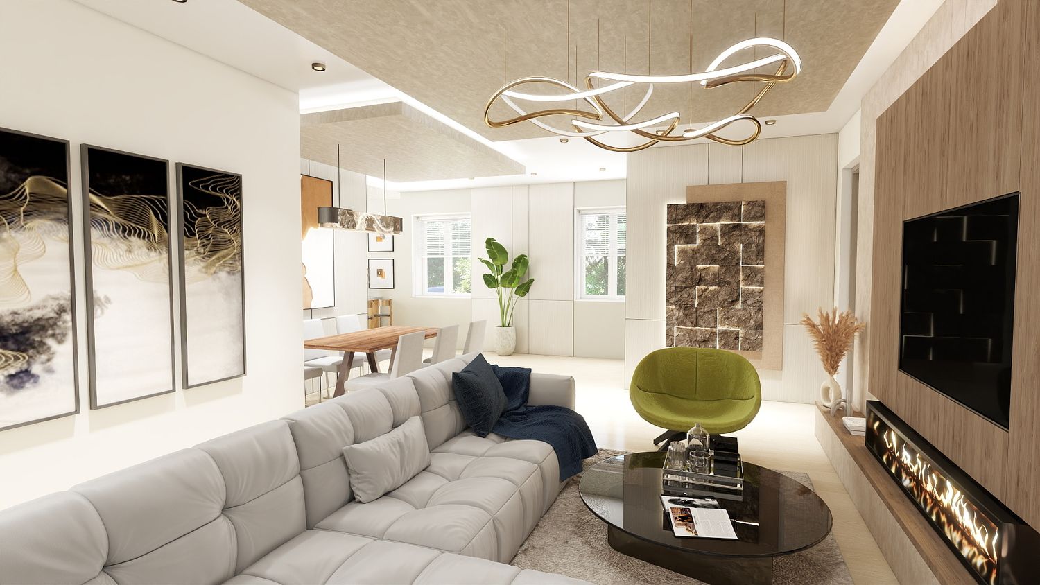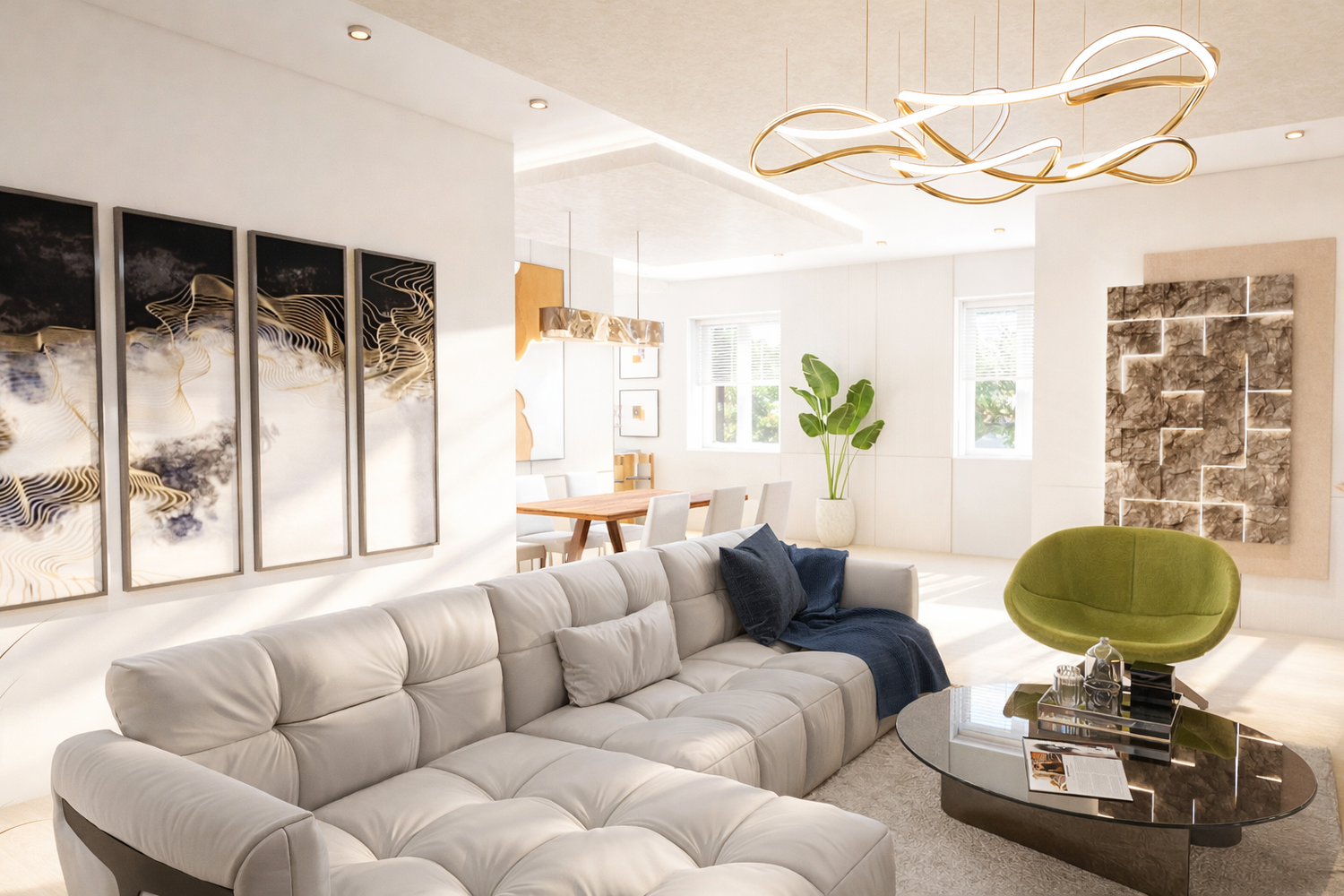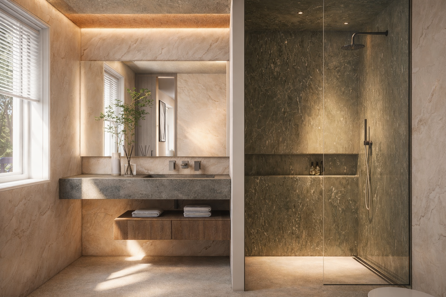 Il progetto propone un interior contemporaneo con accenti warm modern, in cui l’attenzione è posta sulla matericità: legno naturale, superfici minerali e una palette neutra e calda, completate da un’illuminazione ambientale stratificata.