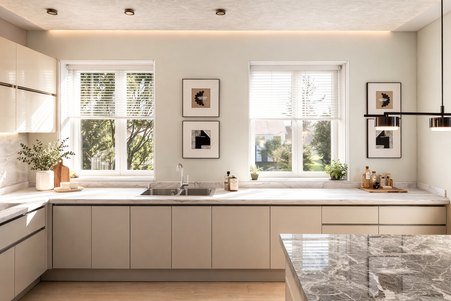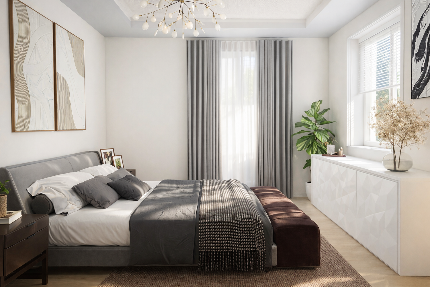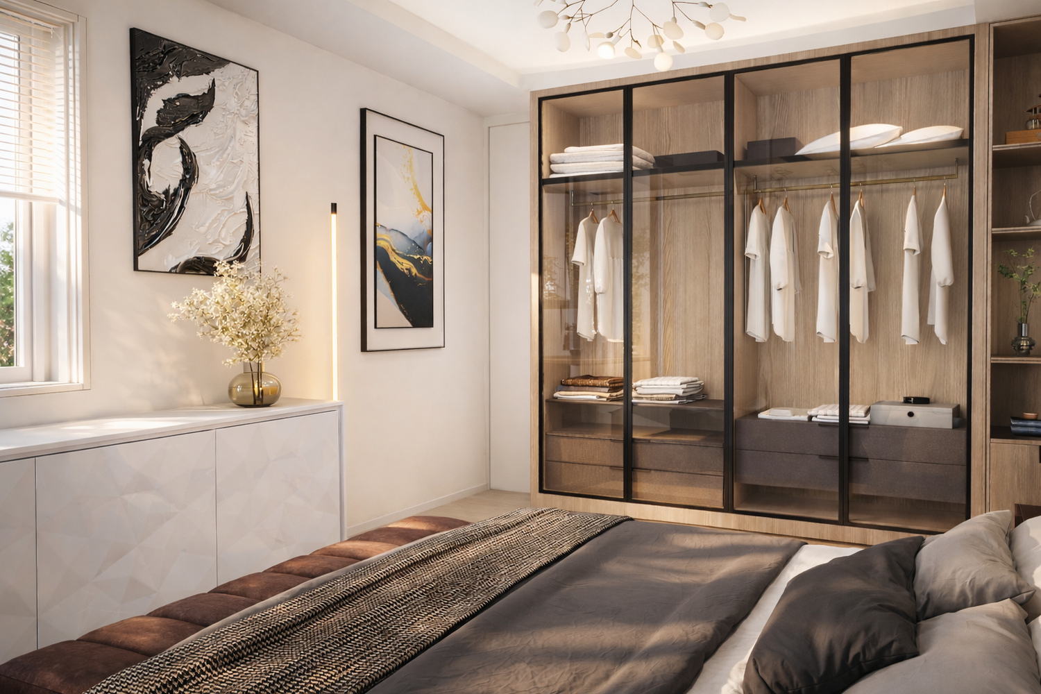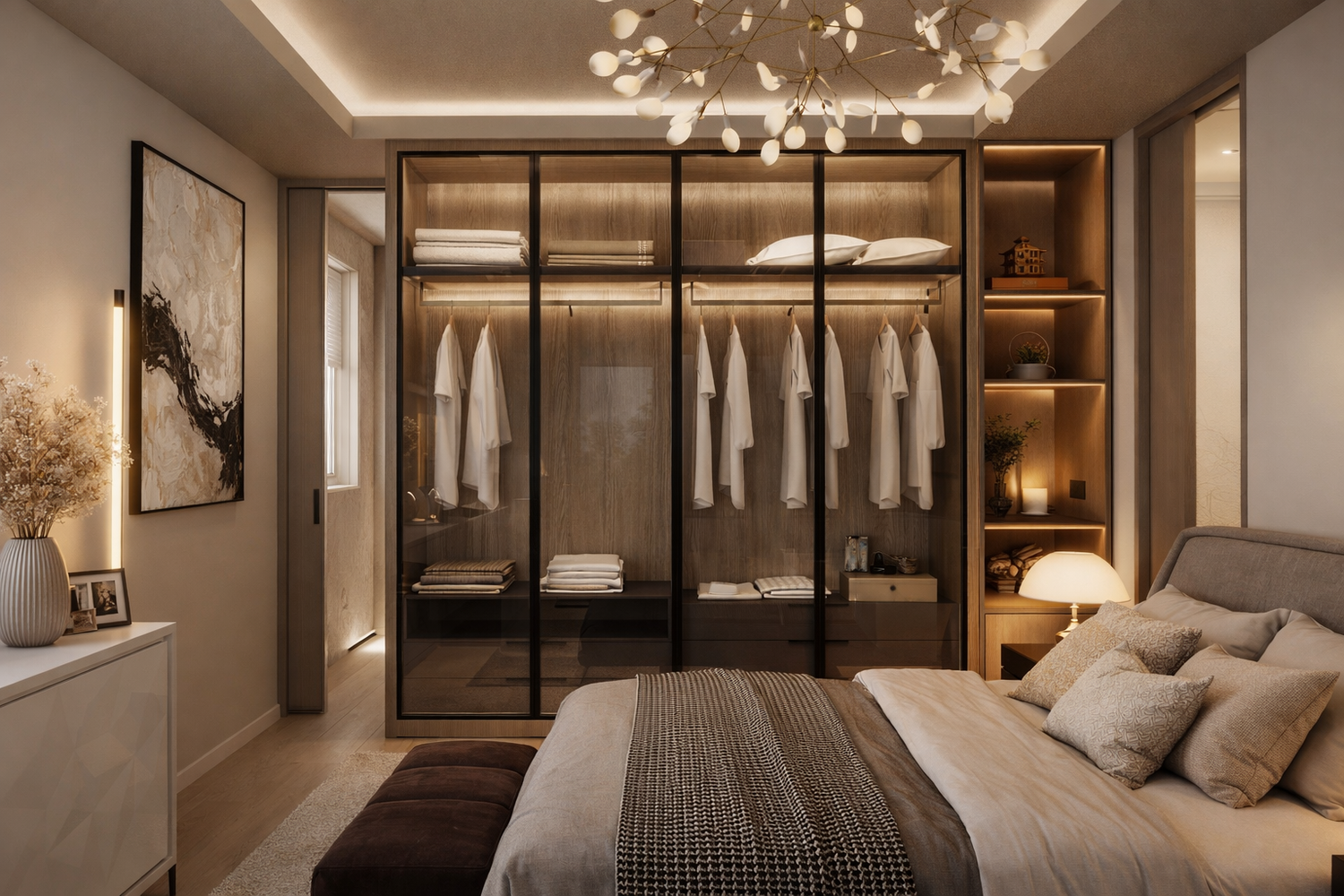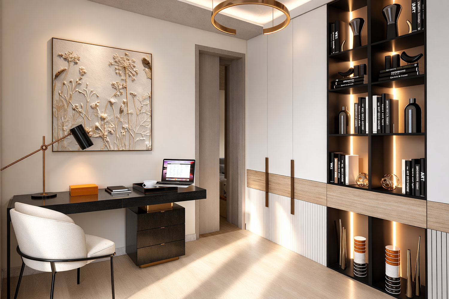Il progetto propone un interior contemporaneo con accenti warm modern, in cui l’attenzione è posta sulla matericità: legno naturale, superfici minerali e una palette neutra e calda, completate da un’illuminazione ambientale stratificata.