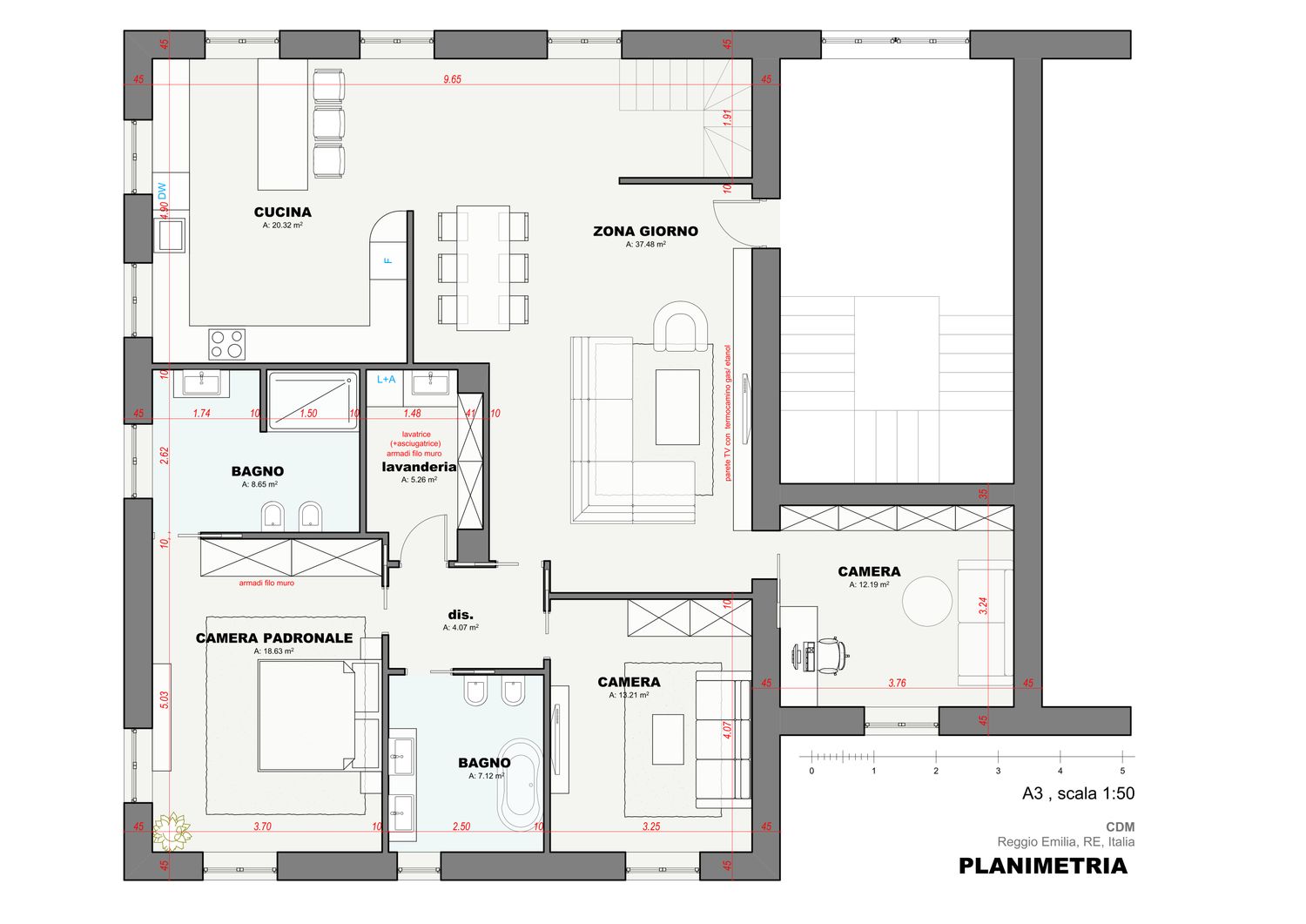 È stata mantenuta la struttura spaziale esistente; l’intervento architettonico è minimo e riguarda esclusivamente la modifica della porta di accesso al bagno matrimoniale. La posizione dei sanitari potrà essere adeguata in fase tecnica per adattarsi agli scarichi esistenti.