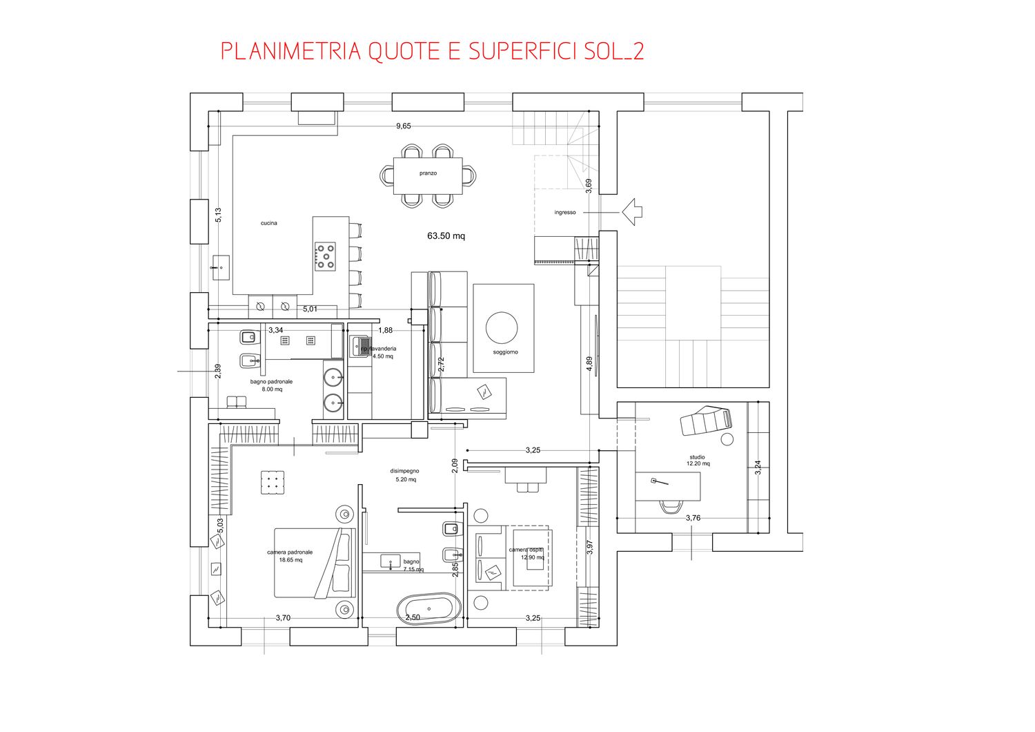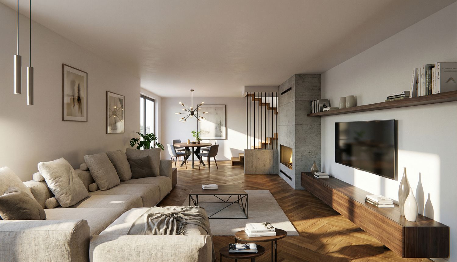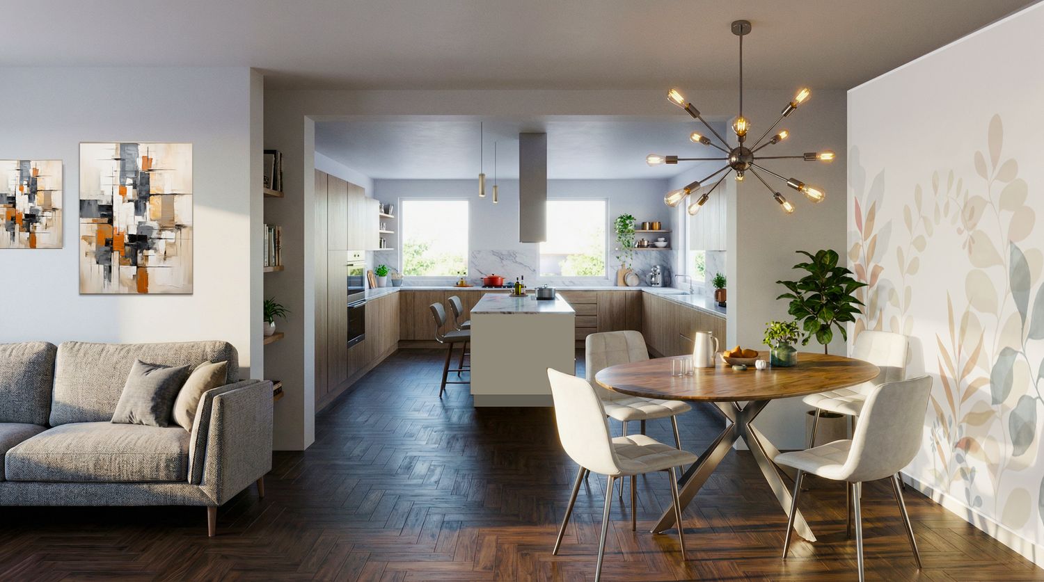 The proposed solution consists of a redesign of the entire apartment, starting with an entrance area with a concealed wardrobe that leads to the large, open-plan living area with a modern and welcoming style. To better showcase the apartment's potential, two similar solutions were proposed regarding the inserted spaces, but with different functional aspects. Specifically, the large kitchen is proposed either with the option of being closed off with elegant sliding panels or open-plan, with a more direct connection to the living area, but always with a dedicated island or peninsula. Furthermore, the laundry closet is proposed directly connected to the kitchen and accessible from the night hallway. There are also two large bedrooms, one with its own bathroom, an additional bathroom with shower and bathtub, and a third bedroom used as a study, directly connected to the living area. Particular attention was paid to space for wardrobes, often integrated flush with the wall so as not to invade the space and to provide an aesthetically appealing as well as functional solution. The colors, as shown in the renderings, are neutral in a contemporary style with elegant yet timeless details.