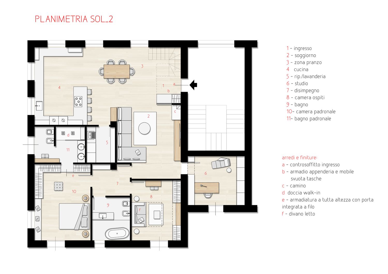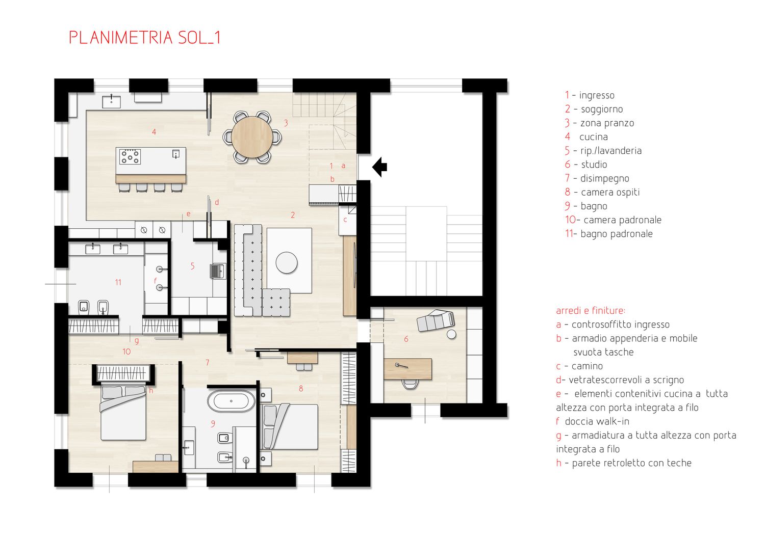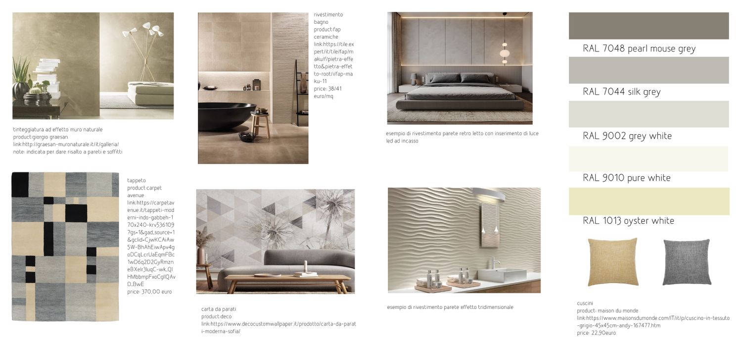 La soluzione proposta consiste in una rifunzionalizzazione dell’intero appartamento a partire da una zona d’ingresso con armadio porta abiti a scomparsa che filtra il grande ambiente giorno open dallo stile moderno ed accogliente. Per meglio evidenziare le potenzialità che può offrire l’appartamento sono state proposte due soluzioni simili per quanto riguarda gli spazi offerti ma con differenti aspetti funzionali. In particolare la grande cucina viene proposta sia con possibilità di essere chiusa tramite eleganti pannelli scorrevoli che open per una comunicazione più diretta con il living, ma sempre con isola o penisola dedicata. Inoltre il ripostiglio lavanderia viene proposto sia collegato direttamente alla cucina che accessibile dal disimpegno notte. Trovano poi spazio le due grandi camere di cui una con bagno dedicato, un ulteriore bagno con doccia e vasca, e la terza camera ad uso studio direttamente comunicante con la zona giorno. Particolare attenzione è stata dedicata allo spazio dedicato agli armadi, spesso integrati a filo parete così da non invadere lo spazio e risultare una soluzione esteticamente accattivante oltre che funzionale. I colori come visibile dai render sono neutri in uno stile contemporaneo con dettagli eleganti e al tempo stesso che non passano di moda.