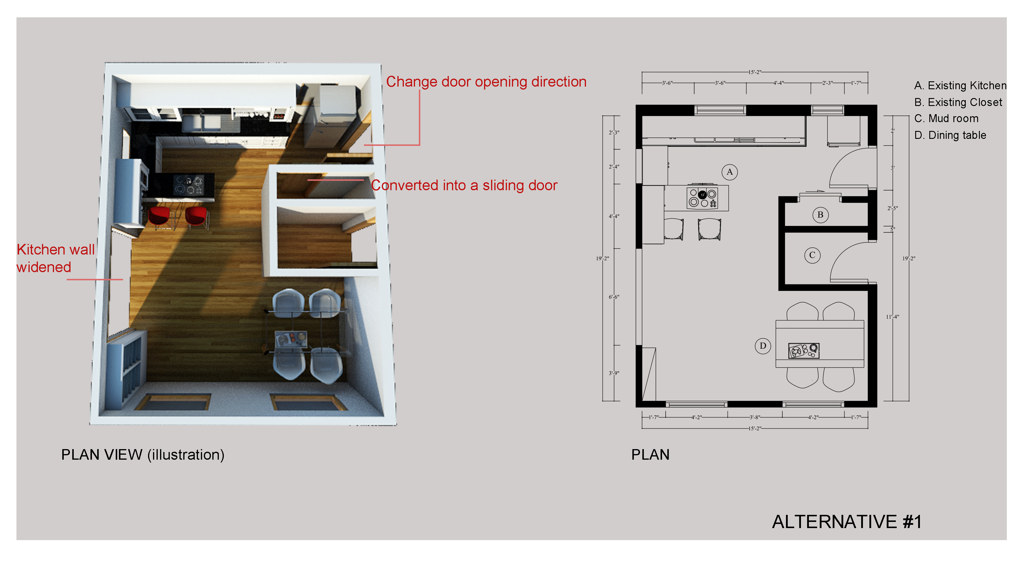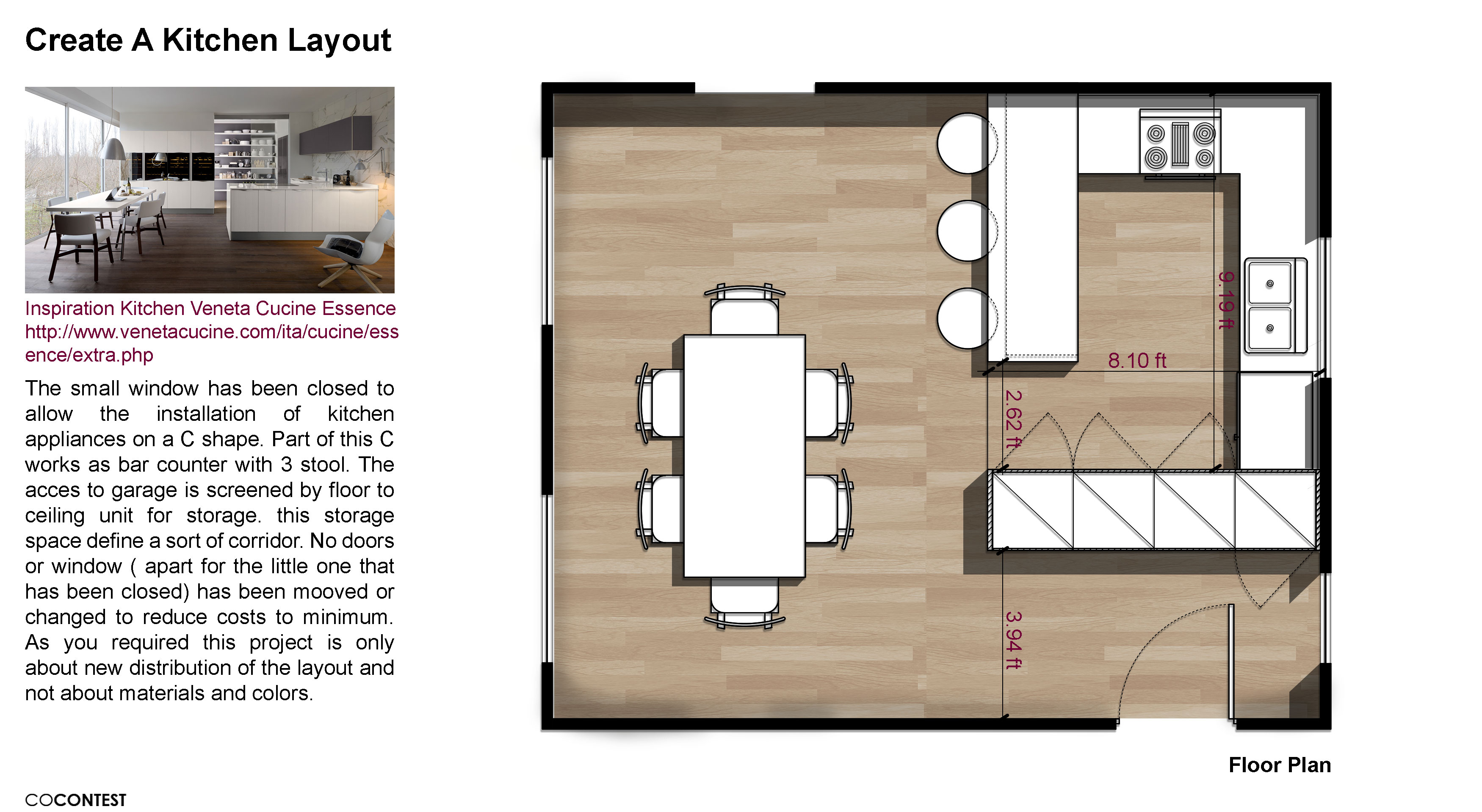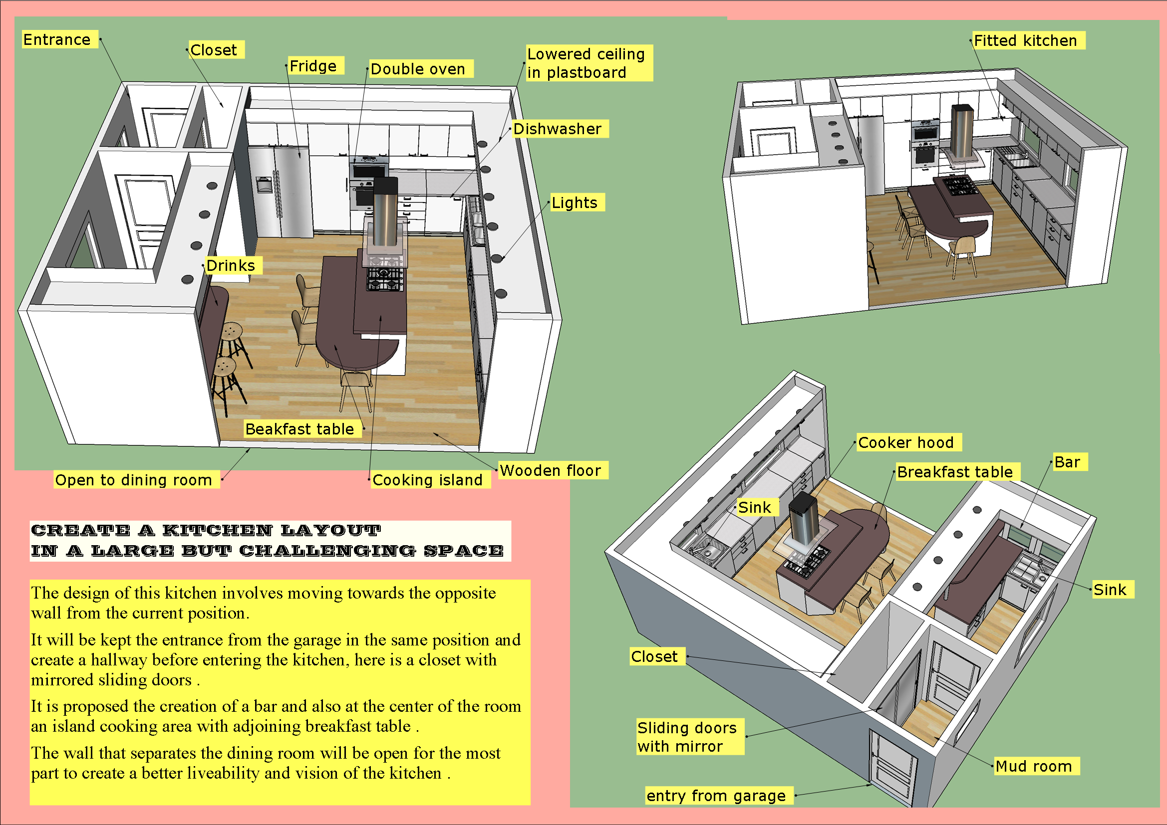 I need a new kitchen layout. My current space is large but there is a lot of wasted space. I do not need design help (colors, etc), only a general layout. There are challenges in my kitchen. The doors to the garage and hallway combined with the window layout limit the options for a redesign. I do not want to move windows but doors could move. There is a small window on the interior wall between my kitchen and dining room. This can change or stay. I'm open to opening it up to a full opening/door into the dining room or even removing most of that wall to create an open plan flowing into the dining room. The closet/pantry can and shoudl be removed from it's current location. I'd also like to see if I could get a small mud room in this space as well. Something to prevent the garage entry from opening direclty into the kitchen. If it helps the door to the garage could also move anywhere on the wall. All dimensions are on the plan. I would like increased cabinet space (full cabinets to the ceiling). A 6 burner gas range and double oven in the design would be cool but not 100% necessary. I don't mind the cook surface being seperate from the oven location. Note...do not pay attention to the 1st page of the PDF. The program I used to draw the current layout made it and I can't guarentee it's accuracy. The floorplan should be relatively accurate though.