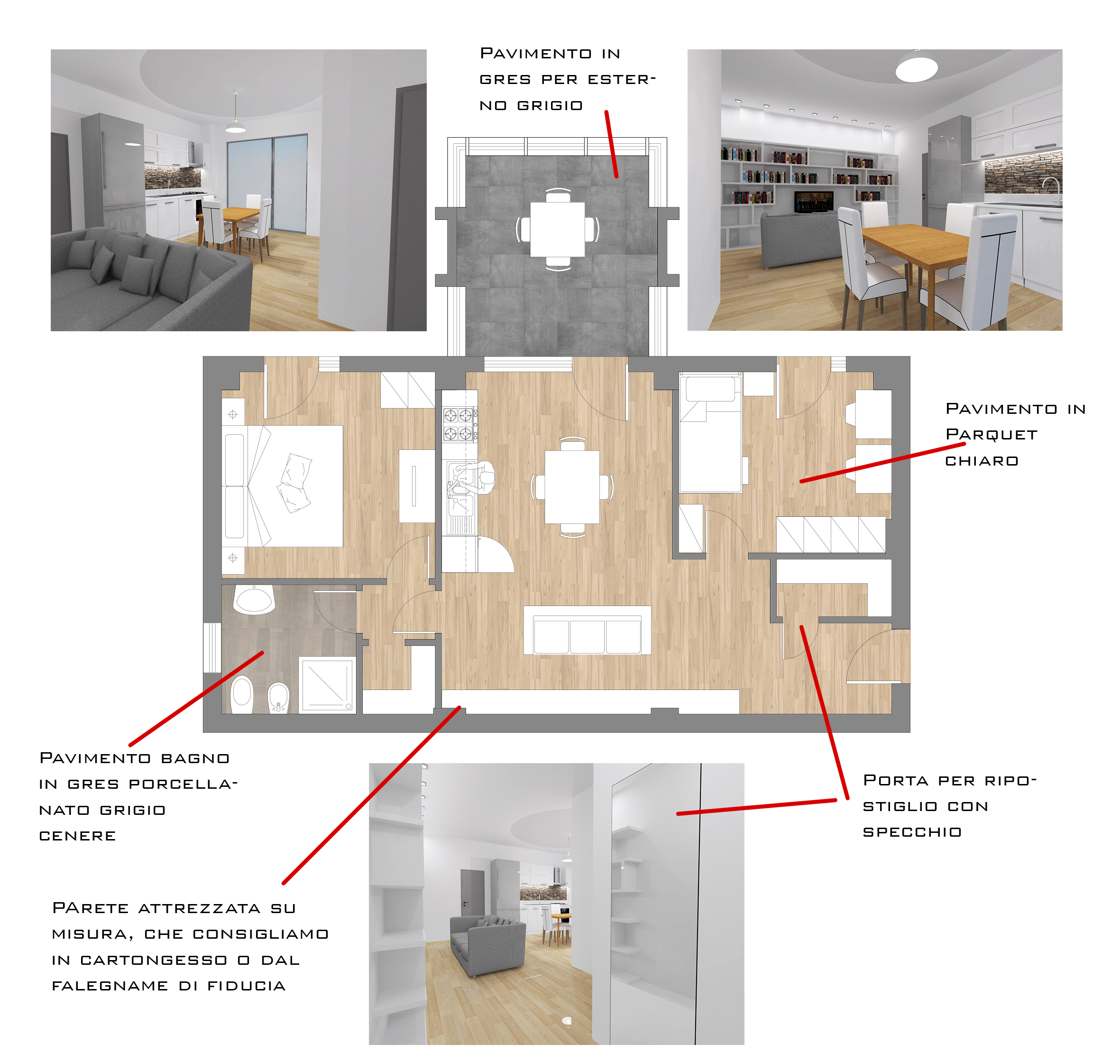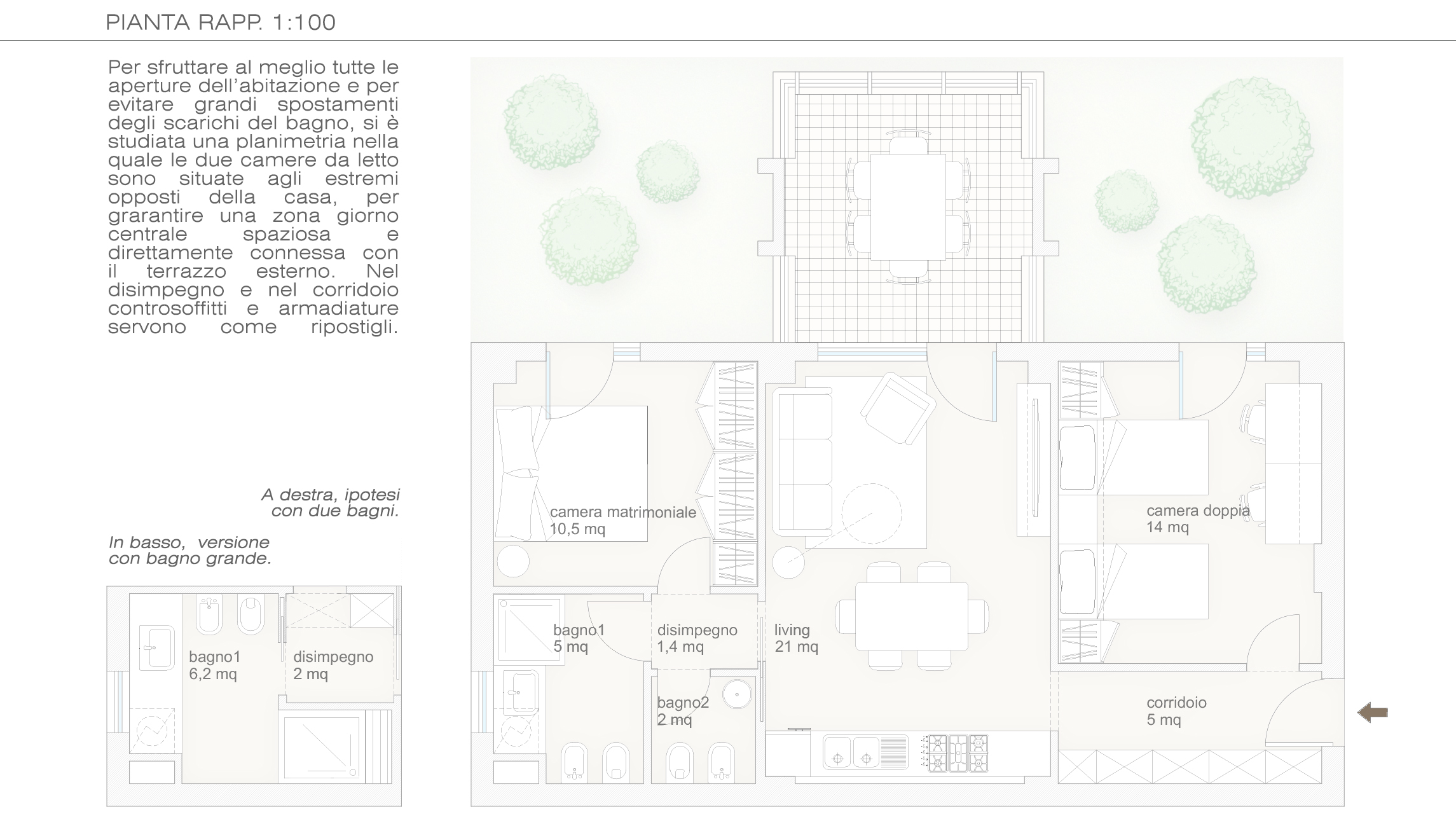 - 1 bagno più grande con doccia ed eventualmente un piccolo bagnetto di servizio.