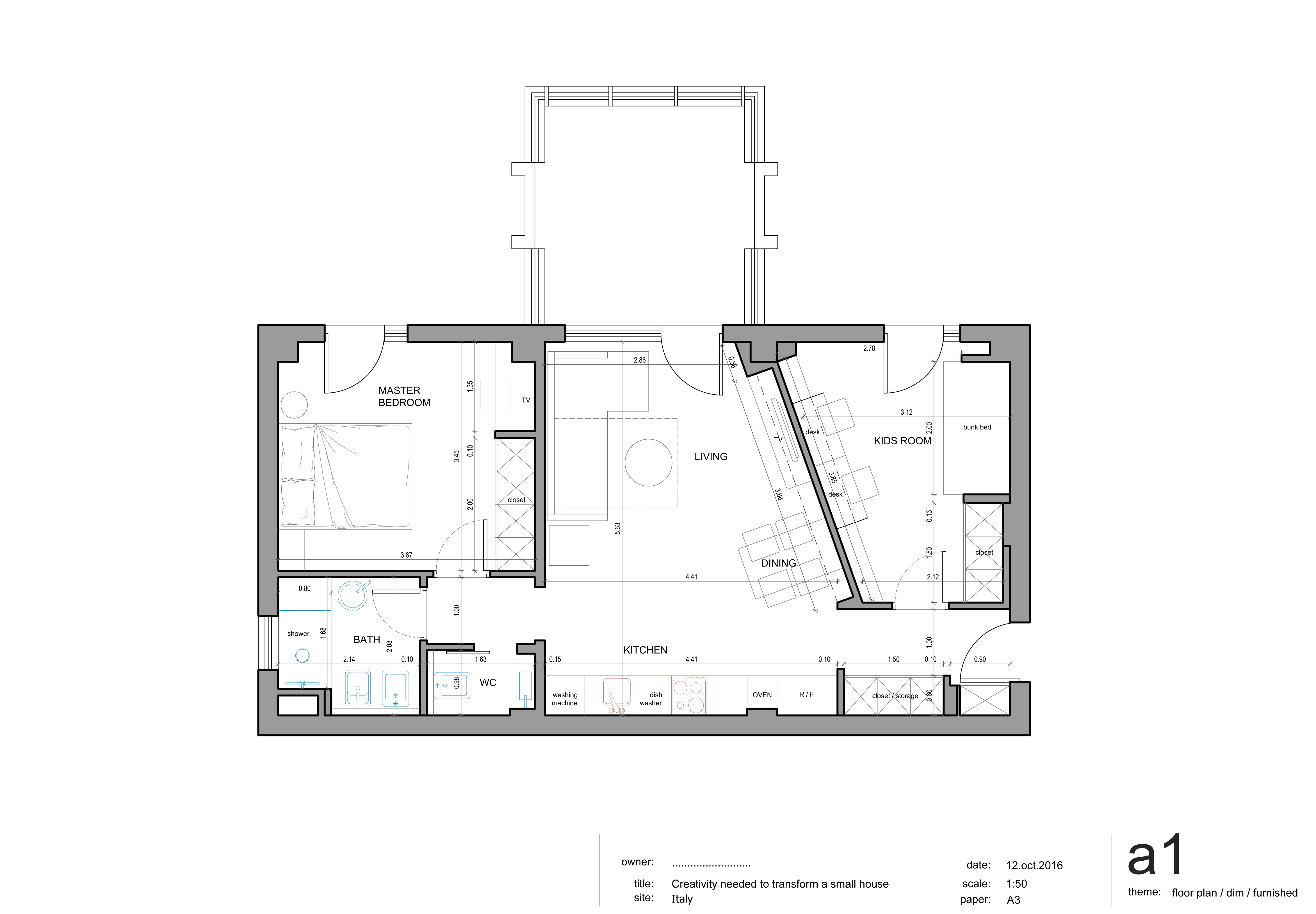- 1 Spazio living eventualmente con cucina a vista. Vorrei però che la casa non ruotasse solo intorno alla cucina. Sarebbe utile trovare lo spazio per un tavolo anche piccolo magari quadrato ed apribile, un bel divano e TV a parete.