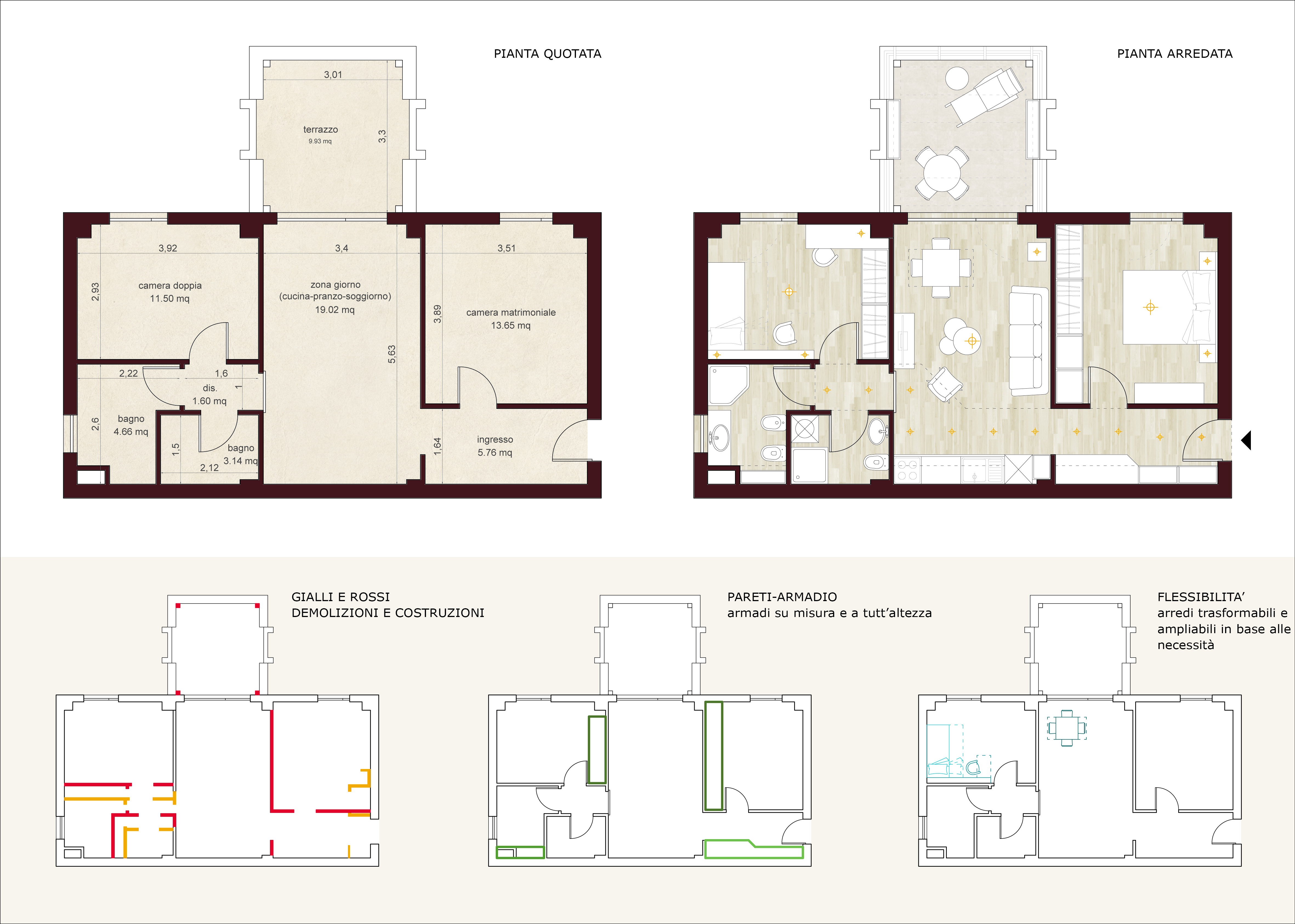 Gli unici vincoli che ci sono nella casa sono le finestre che di fatto non possono essere spostate o modificate nella forma e nella dimensione. La finestra più grande affaccia su un terrazzo di 12 mq con vista sul verde che ho intenzione di attrezzare con delle coperture ed un tavolo.