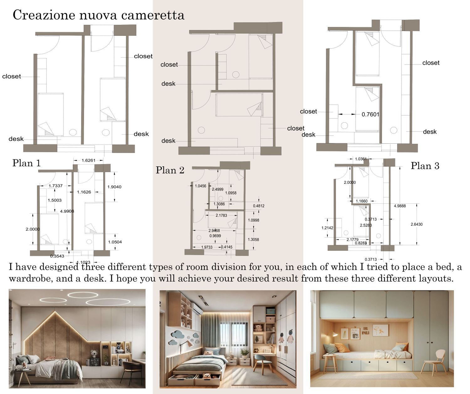 I have designed three different types of room division for you, in each of which I tried to place a bed, a wardrobe, and a desk. I hope you will achieve your desired result from these three different layouts.